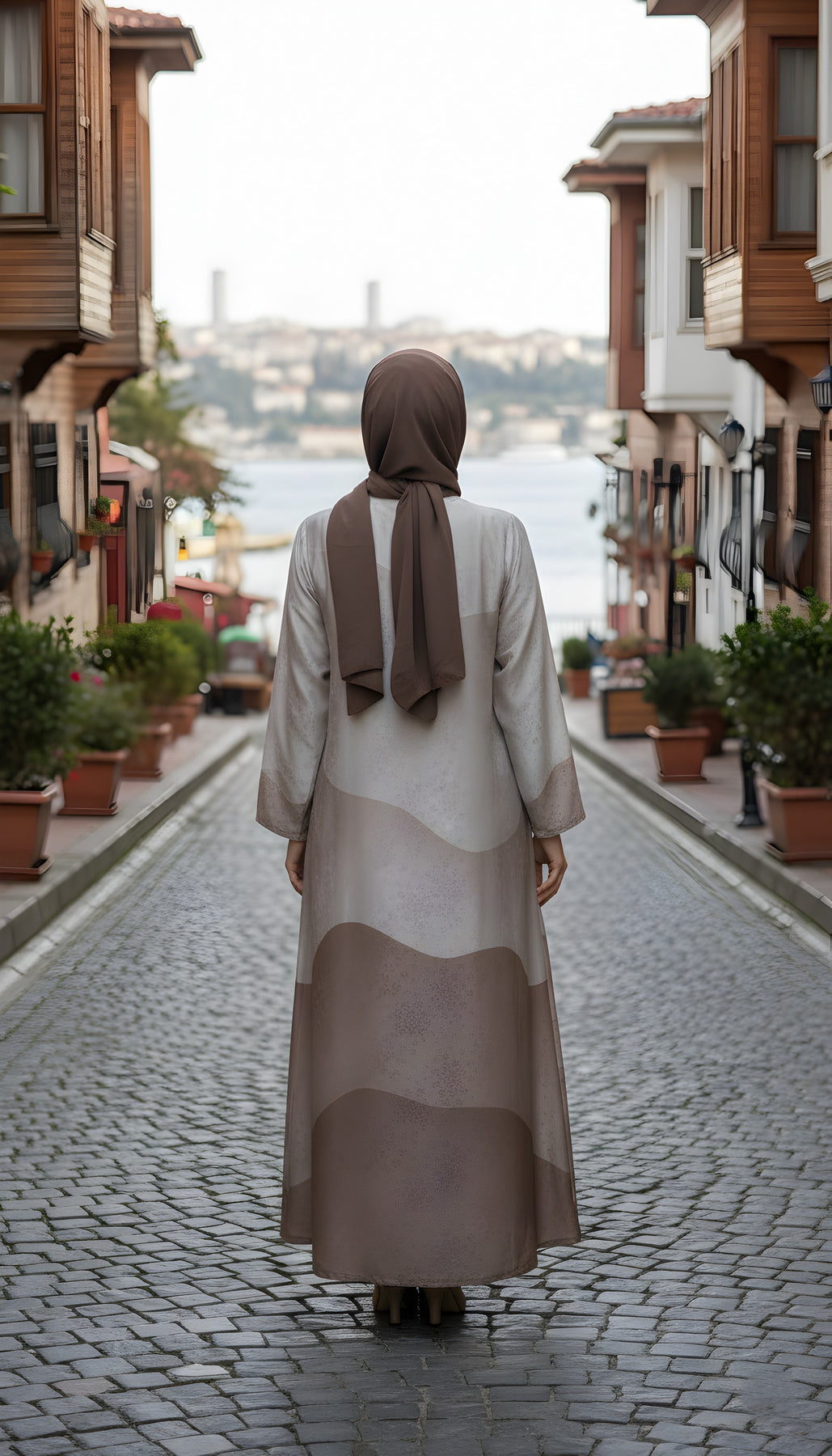 🤎 Gown-Style Silhouette – Long, flowing cut that offers modest coverage and graceful movement.