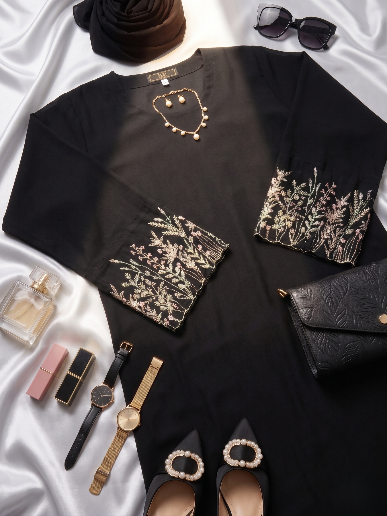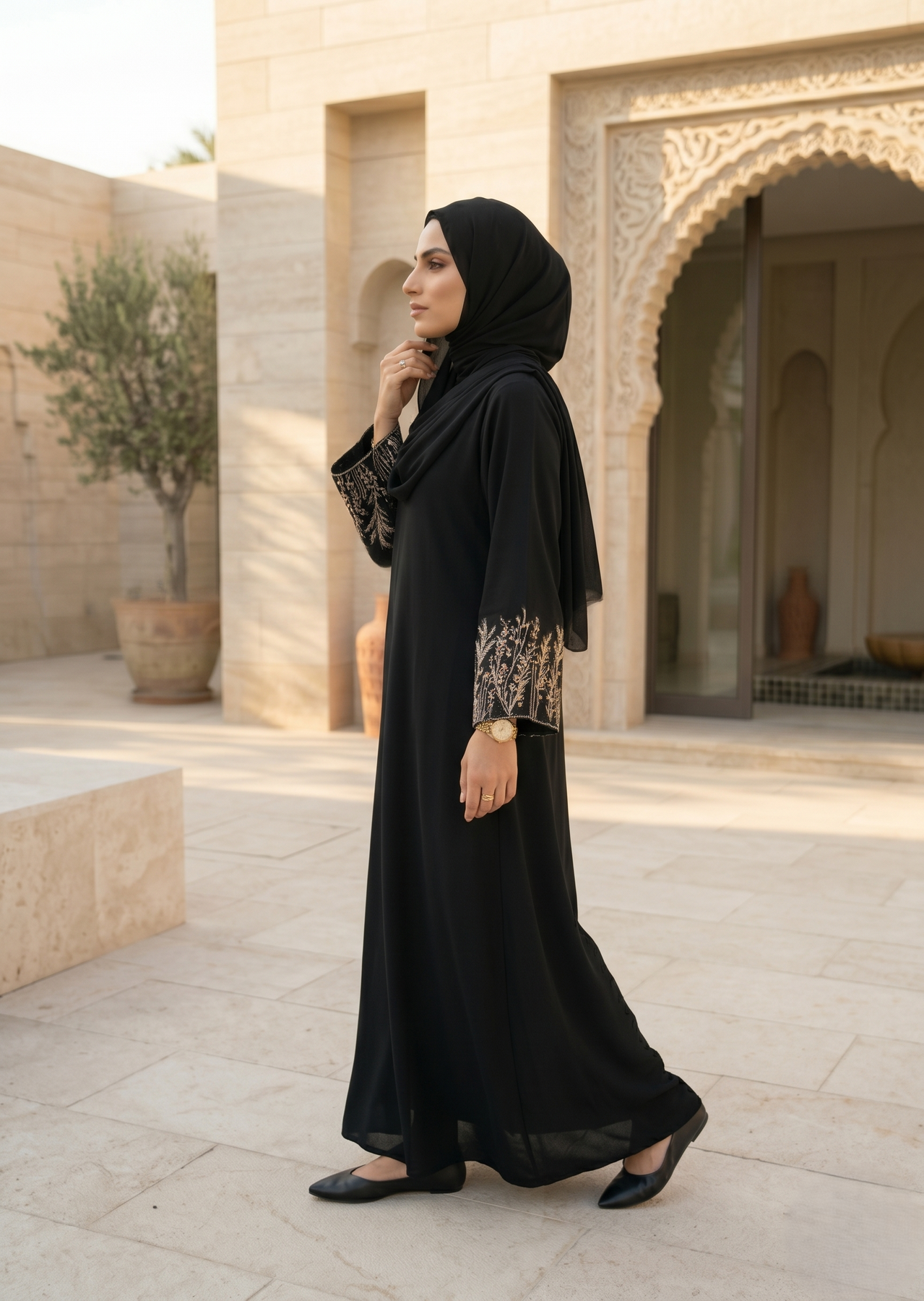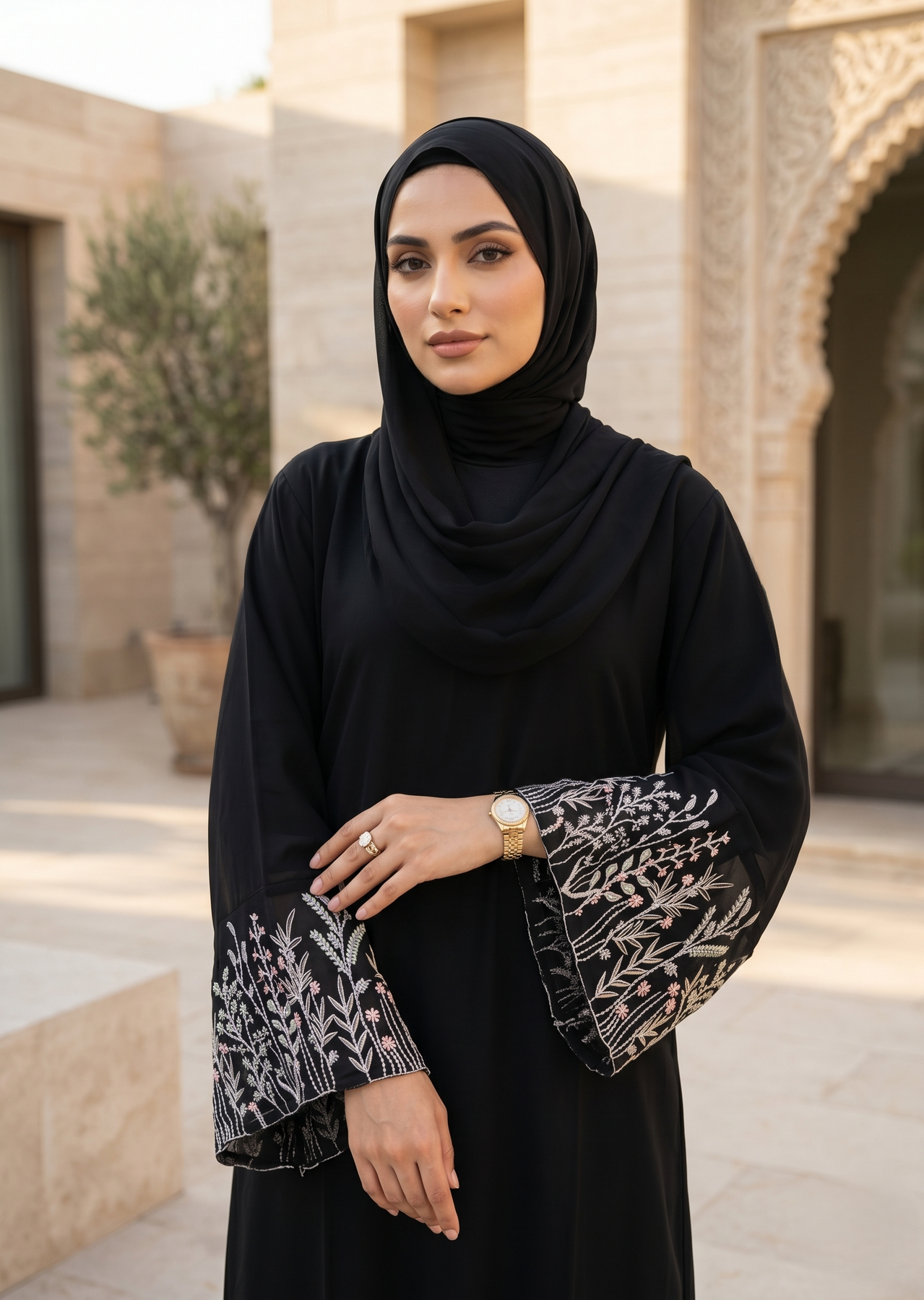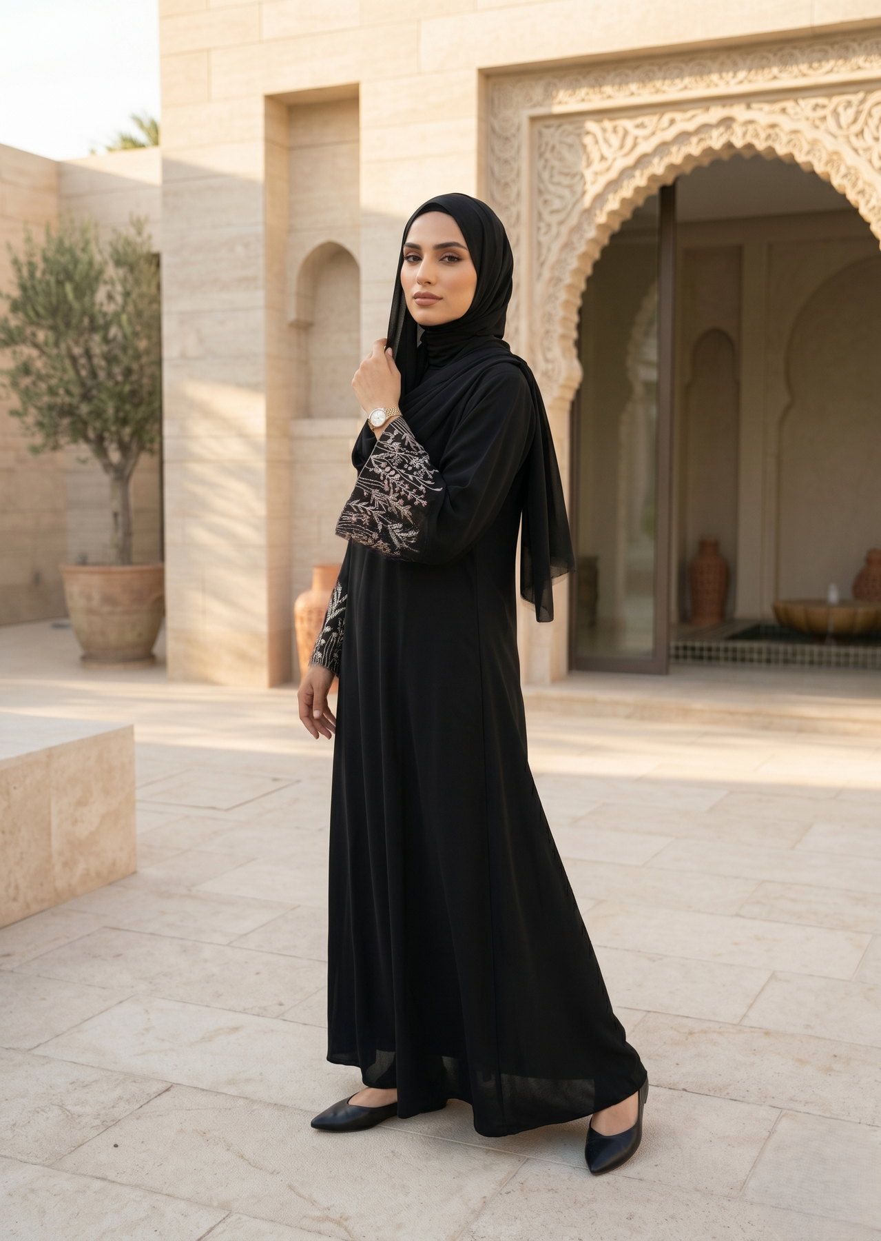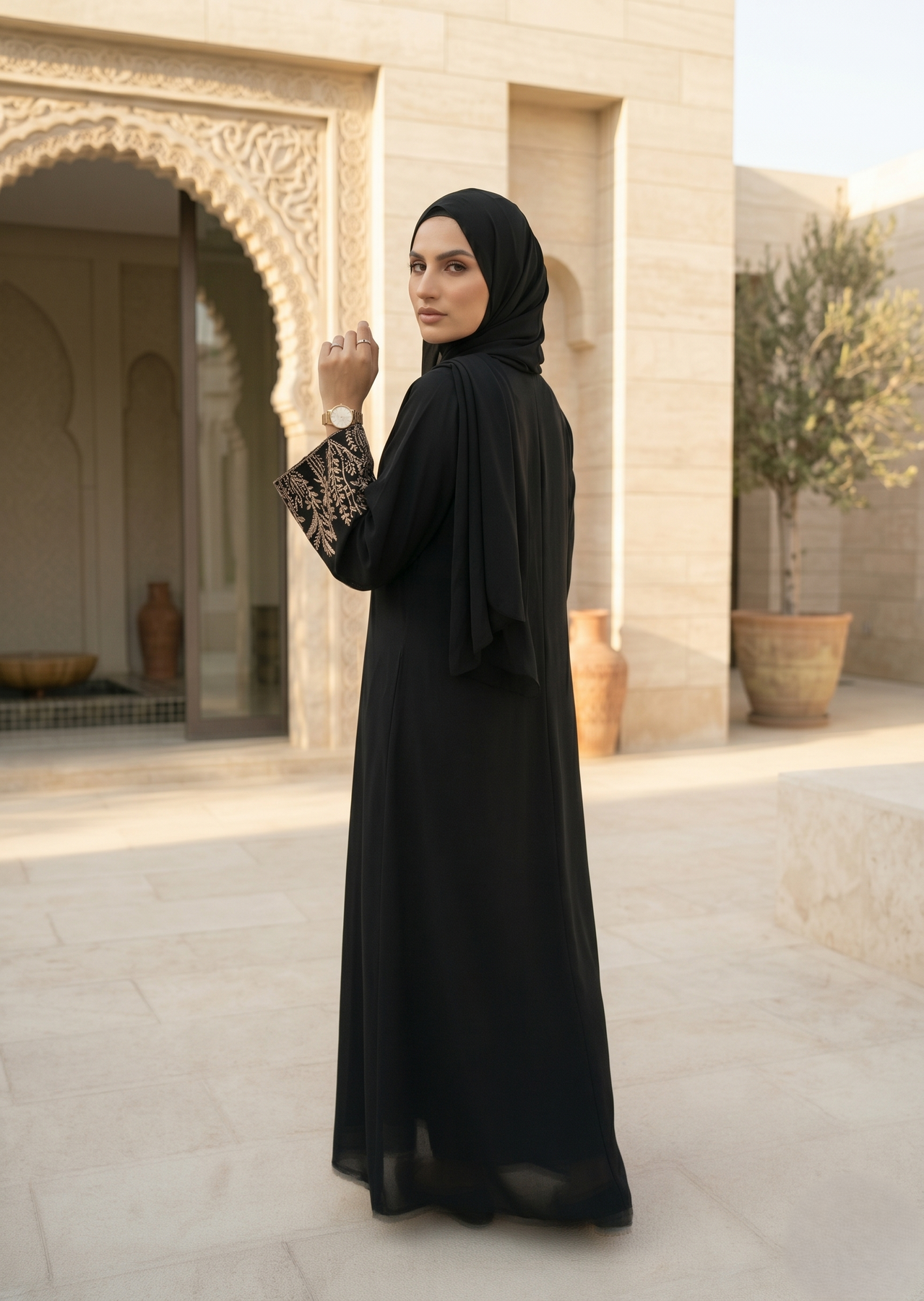 Our beautiful style maxi abaya is best for all day everyday wear which is soft and breathable premium Dubai fabric with embroidery on sleeves, which is sober and elegant design which is best to carry and comes along with chiffon embroidered Sheila