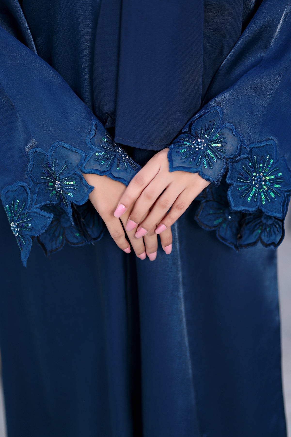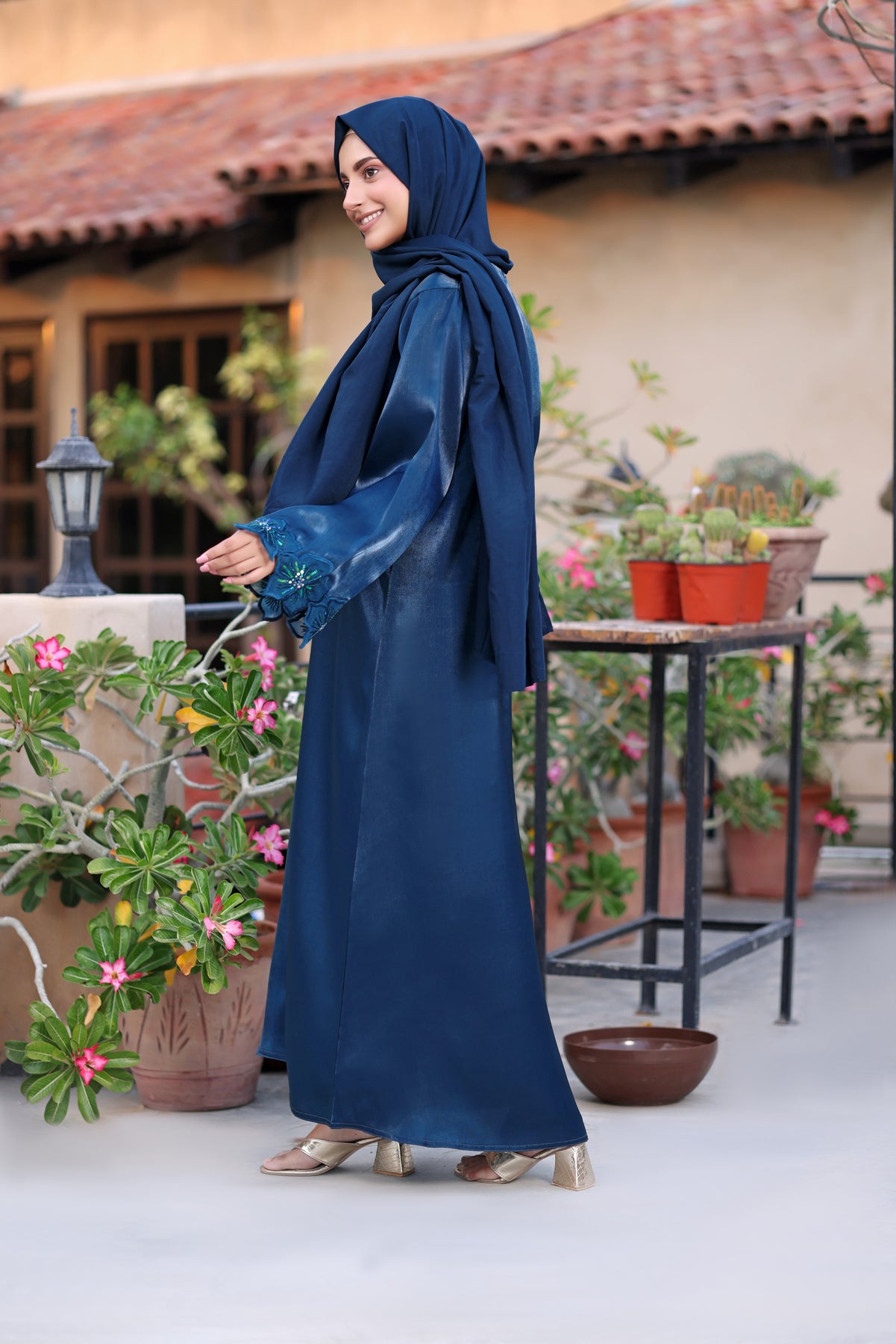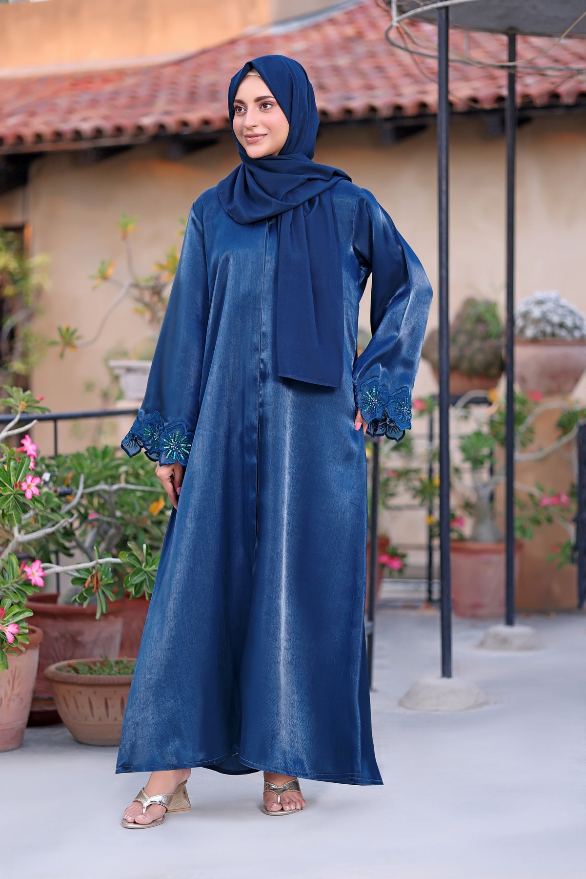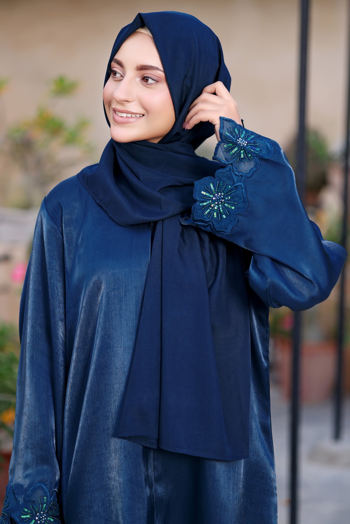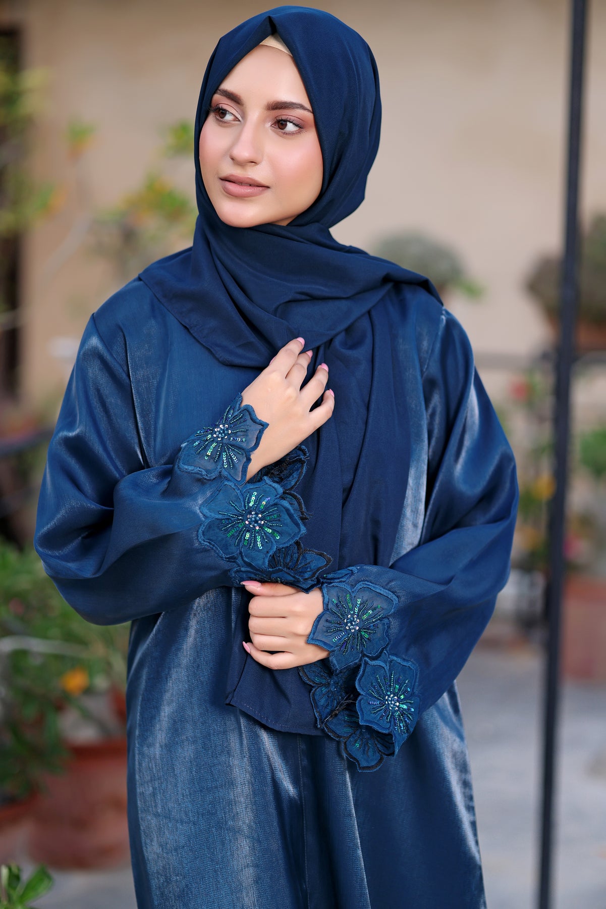 Classic elegance meets refined detailing in  this Abaya. Designed with a graceful flowing silhouette, this abaya exudes timeless sophistication with a modern touch. The rich midnight blue tone, enhanced by a soft satin-like sheen, creates a luxurious yet understated look. Delicate floral embroidery on the cuffs adds a subtle statement. Finished with a perfectly coordinated hijab, it’s an effortless choice for both everyday wear and special gatherings.