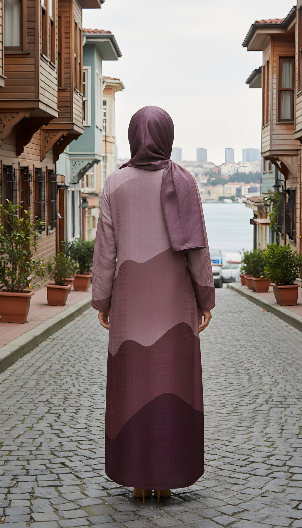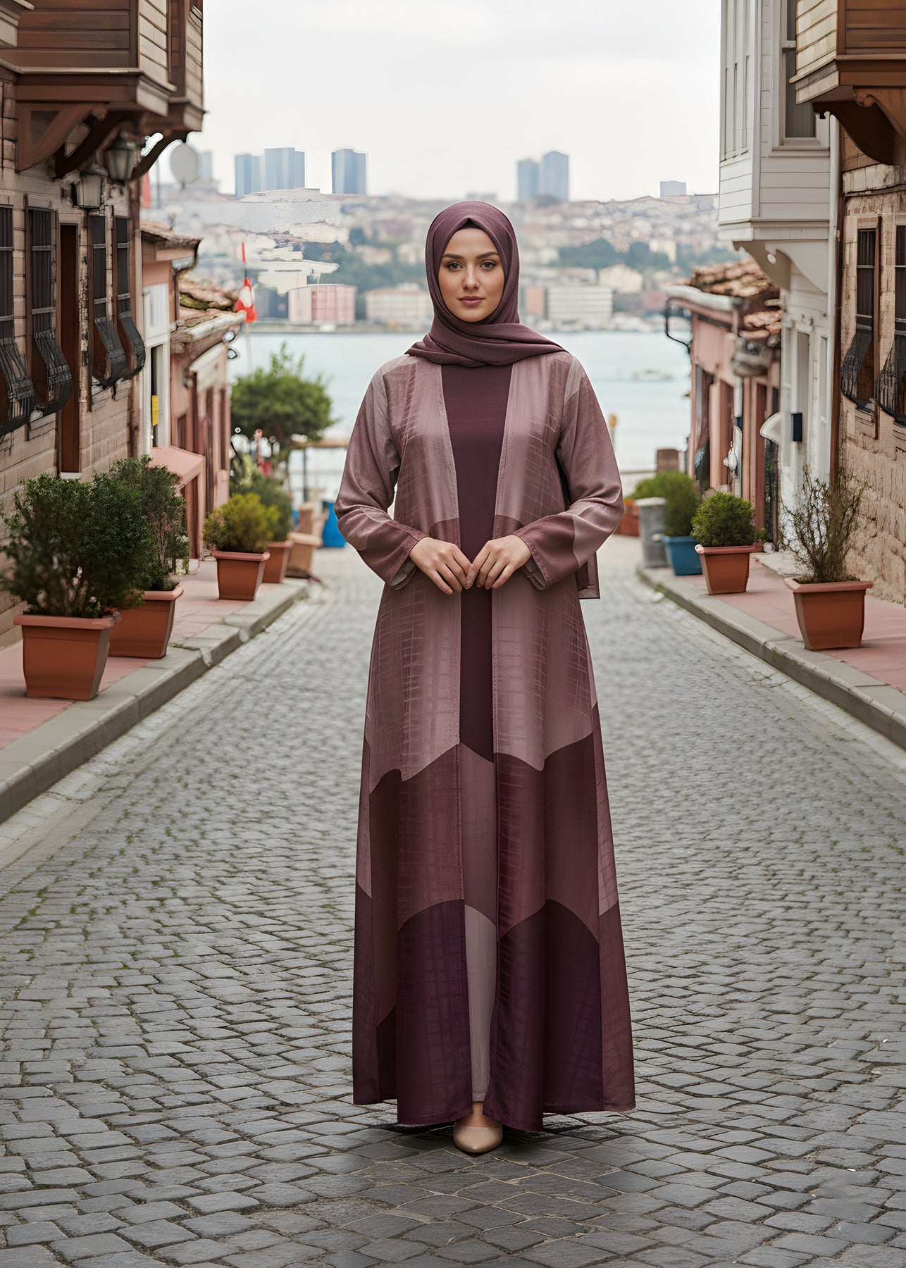 Gracefully flowing with refined structure, this gown-style modest dress is a celebration of soft movement and artistic elegance. Designed in a rich palette of muted mauve, dusty rose, and deep plum tones, the piece features subtle tonal paneling that creates visual depth while maintaining a calm, sophisticated aesthetic.