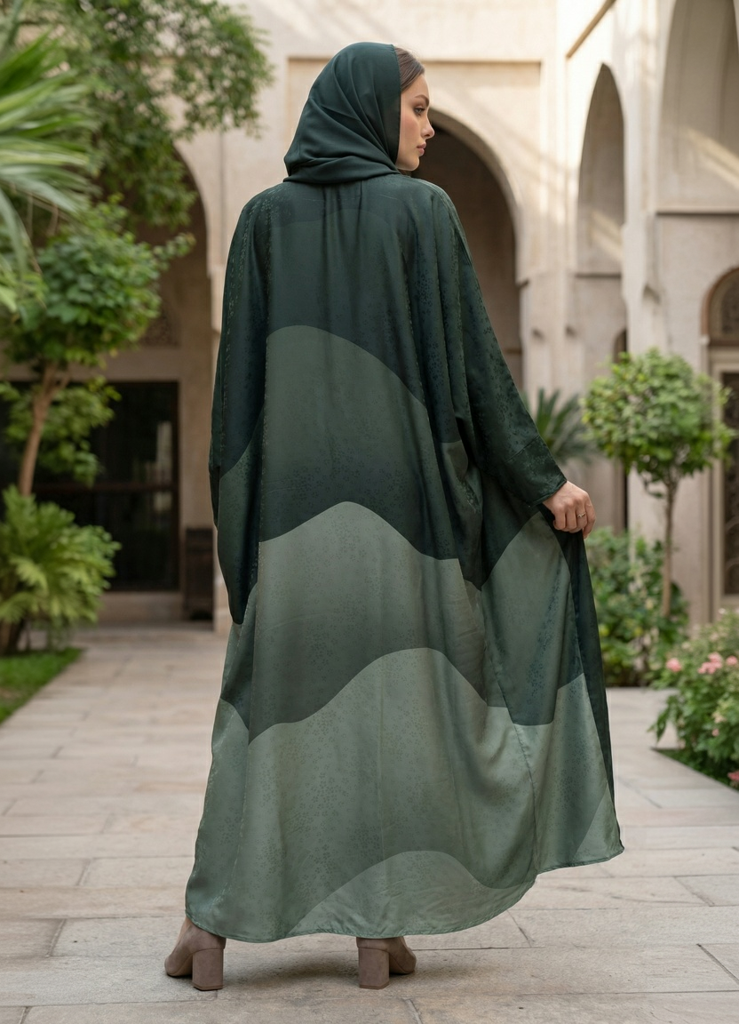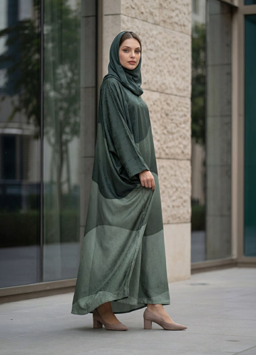 Gracefully fluid with cool-toned sophistication, this Tonal Green Maxi Style Abaya is a refined expression of modern modest elegance. Crafted from a softly textured fabric, the design showcases artistic tonal paneling in layered grey shades, creating depth, movement, and a naturally flowing silhouette. Its airy drape and minimalist construction make it ideal for women who appreciate calm, contemporary style with understated luxury.