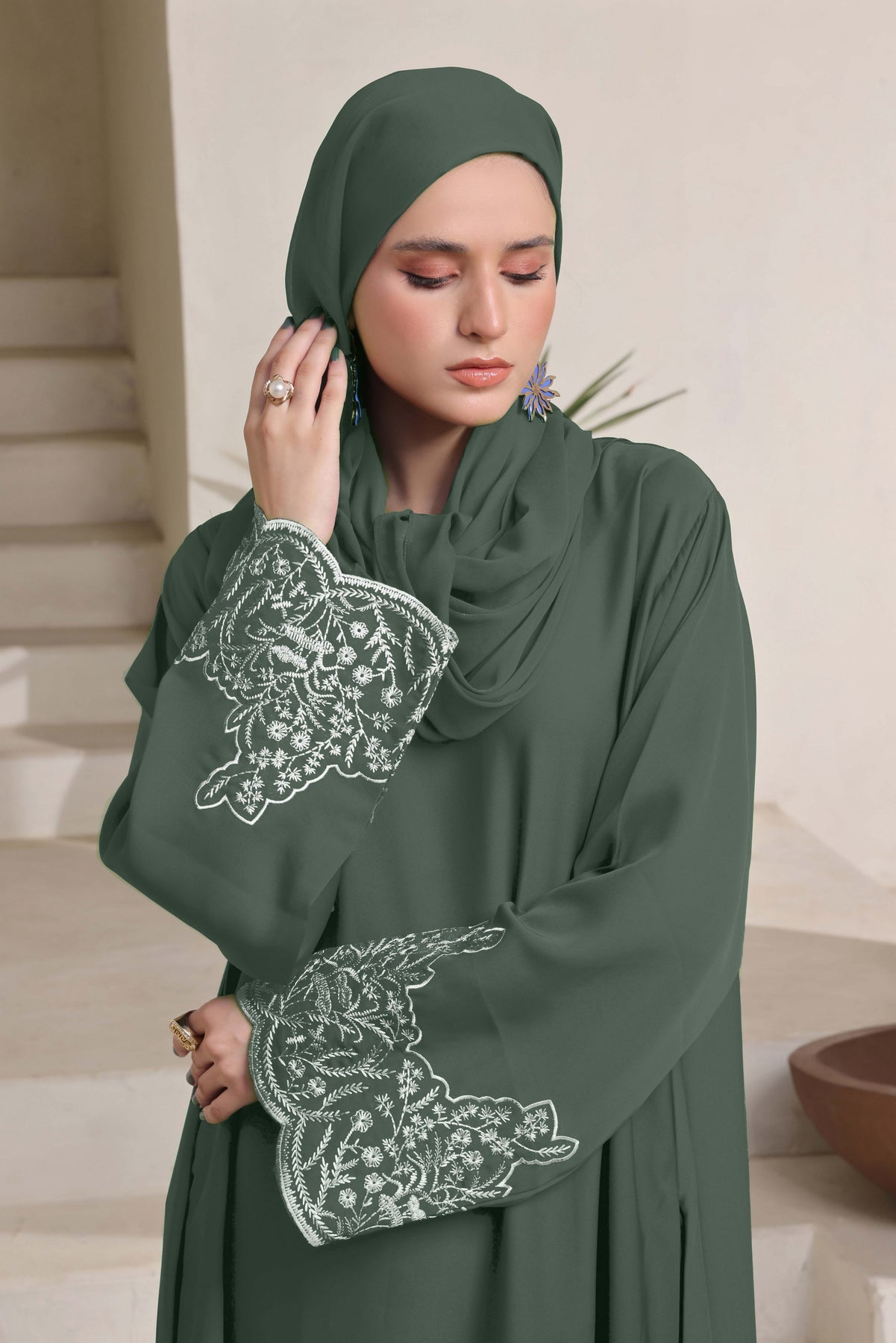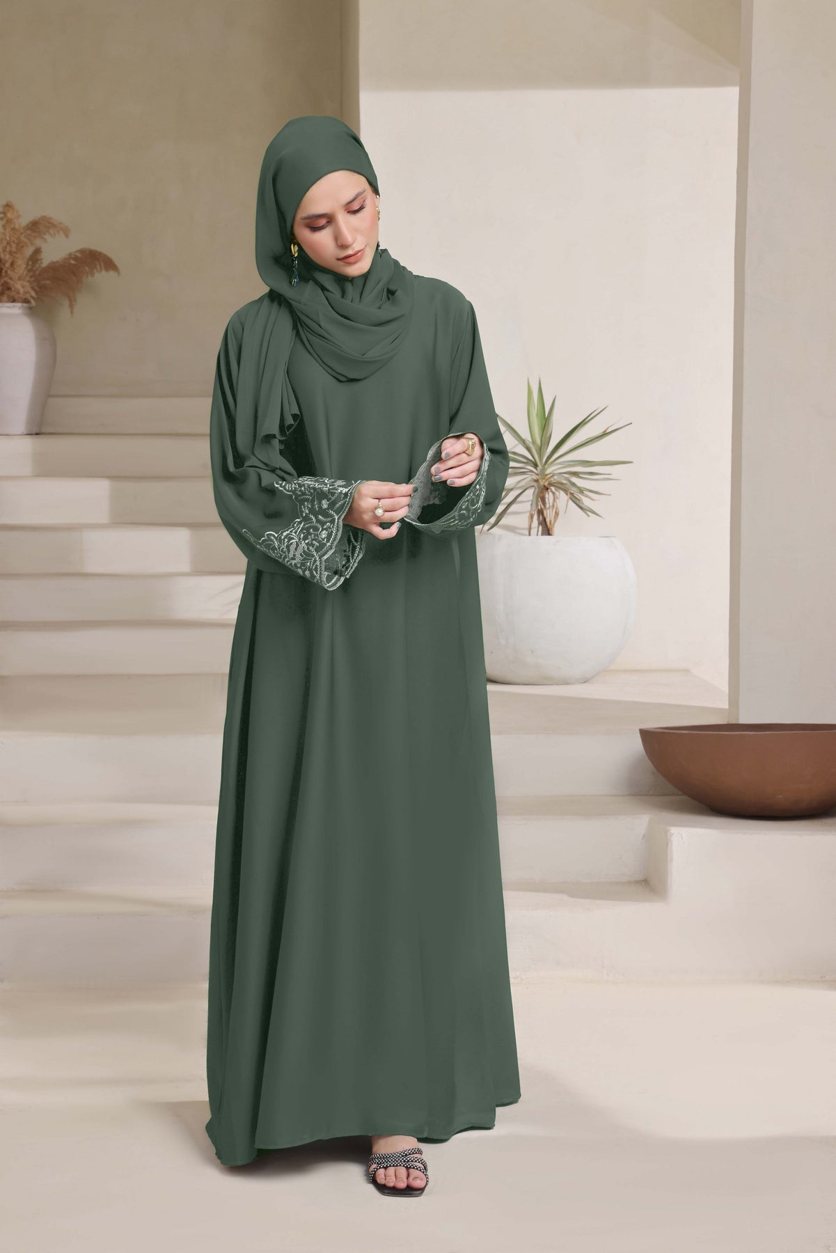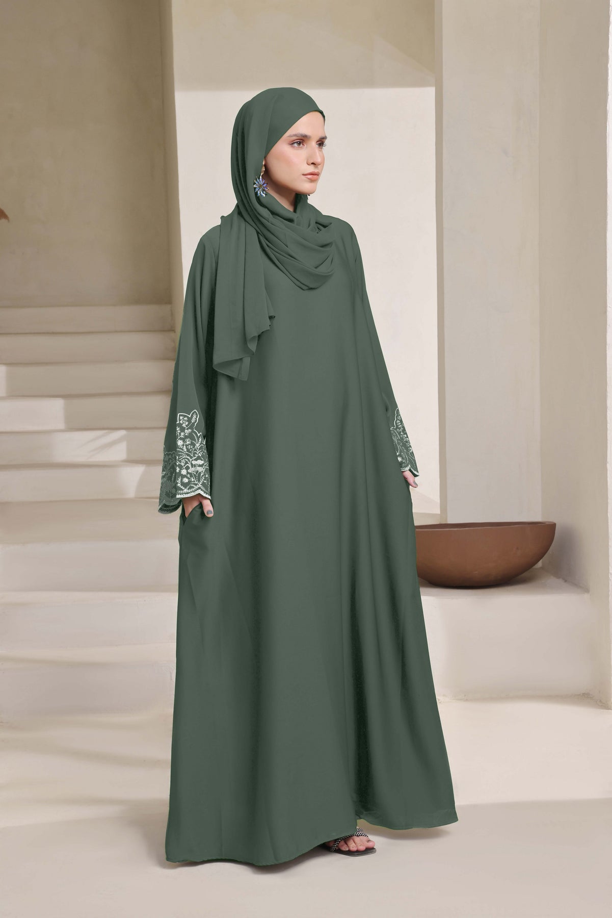 Soft tones, flowing elegance, and delicate detailing this is designed for the modern woman who appreciates subtle sophistication. Crafted from premium Nidha fabric in a unique greenish-gray hue, this maxi-style abaya features beautifully embroidered sleeves that add just the right touch of charm. Paired with a matching hijab, it offers a complete, polished look perfect for any occasion.
