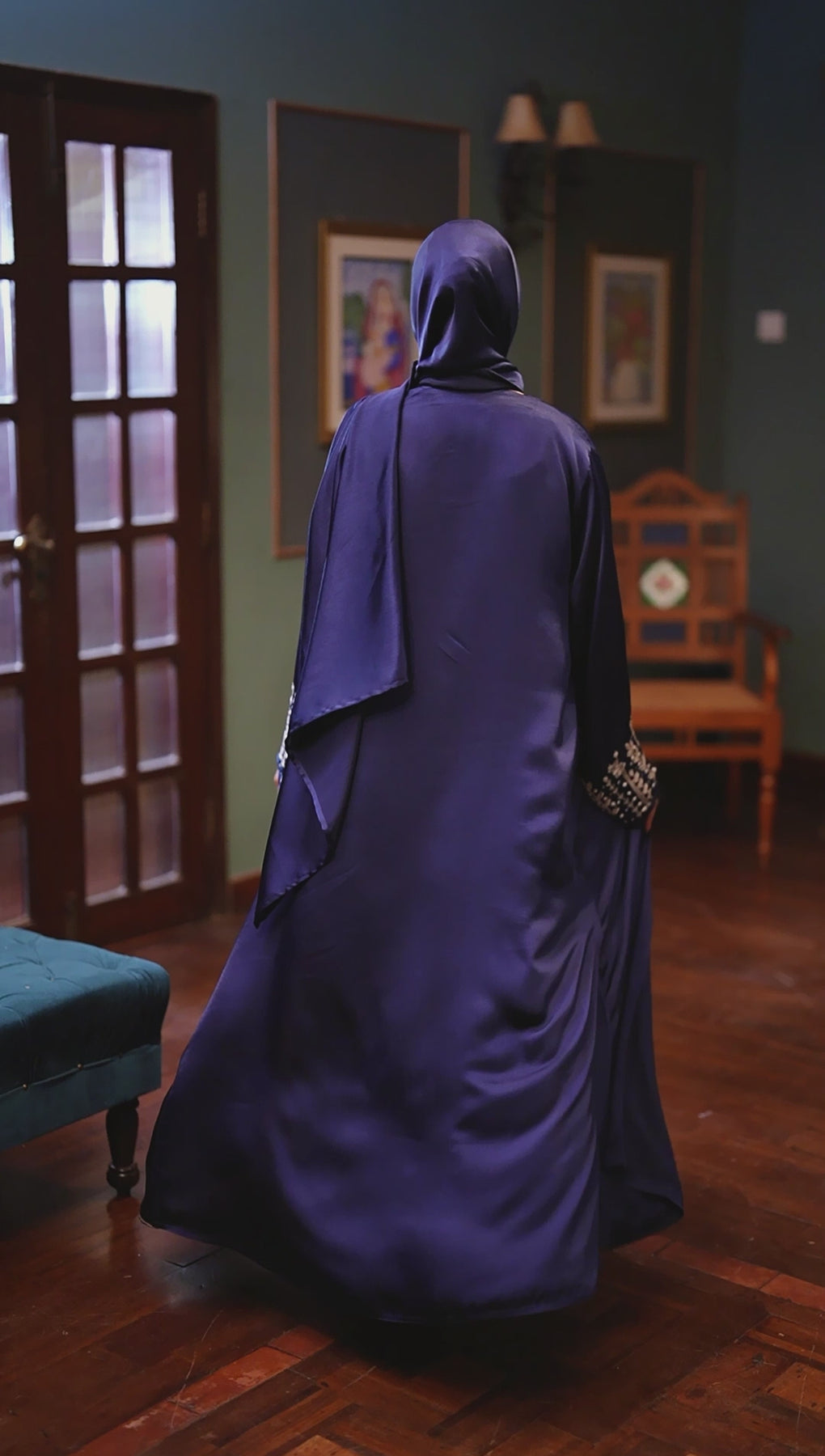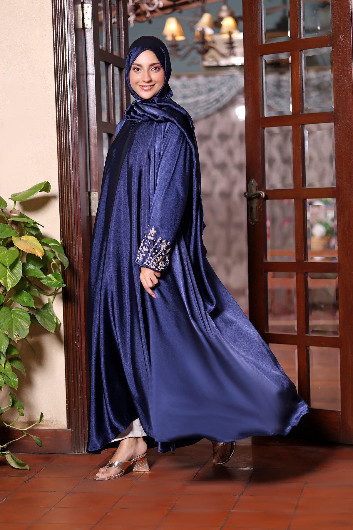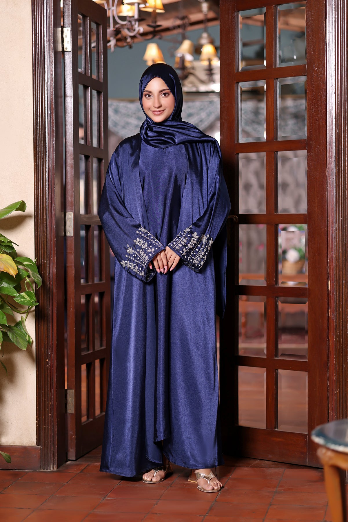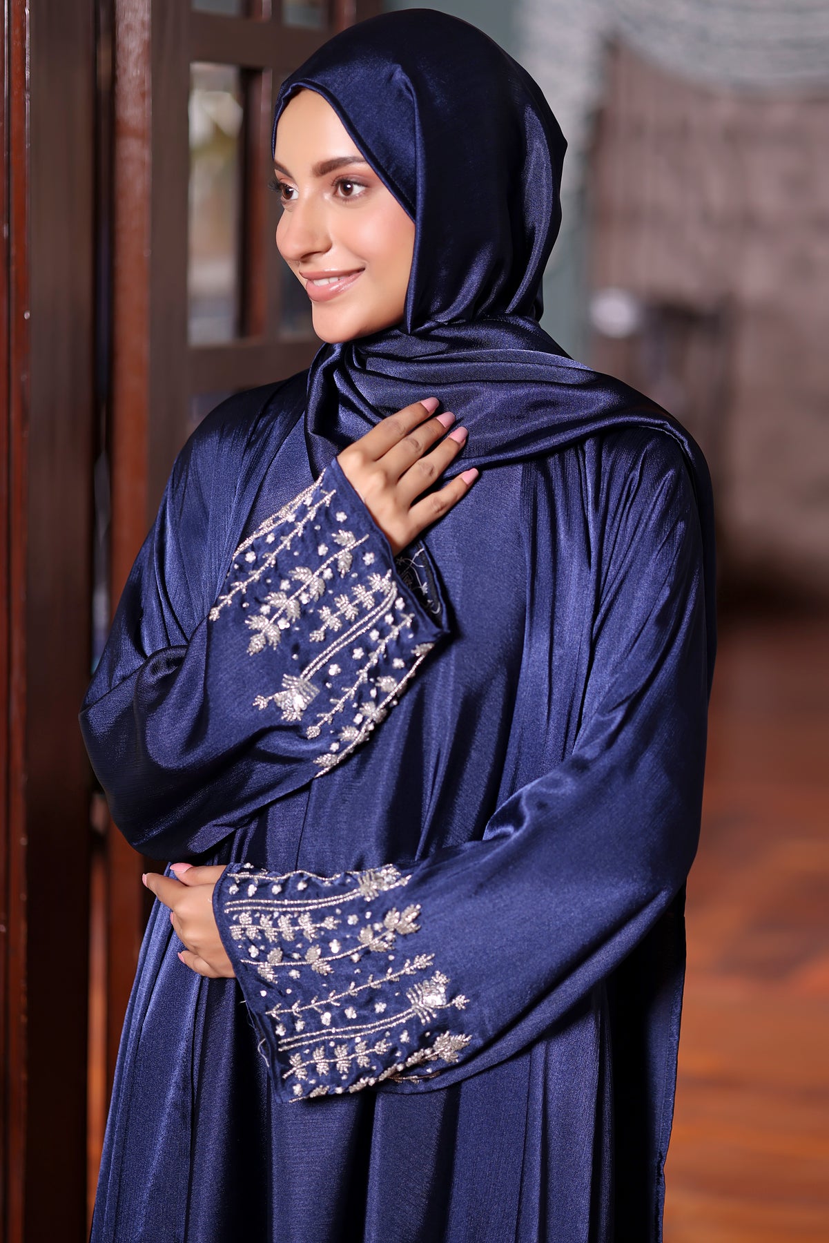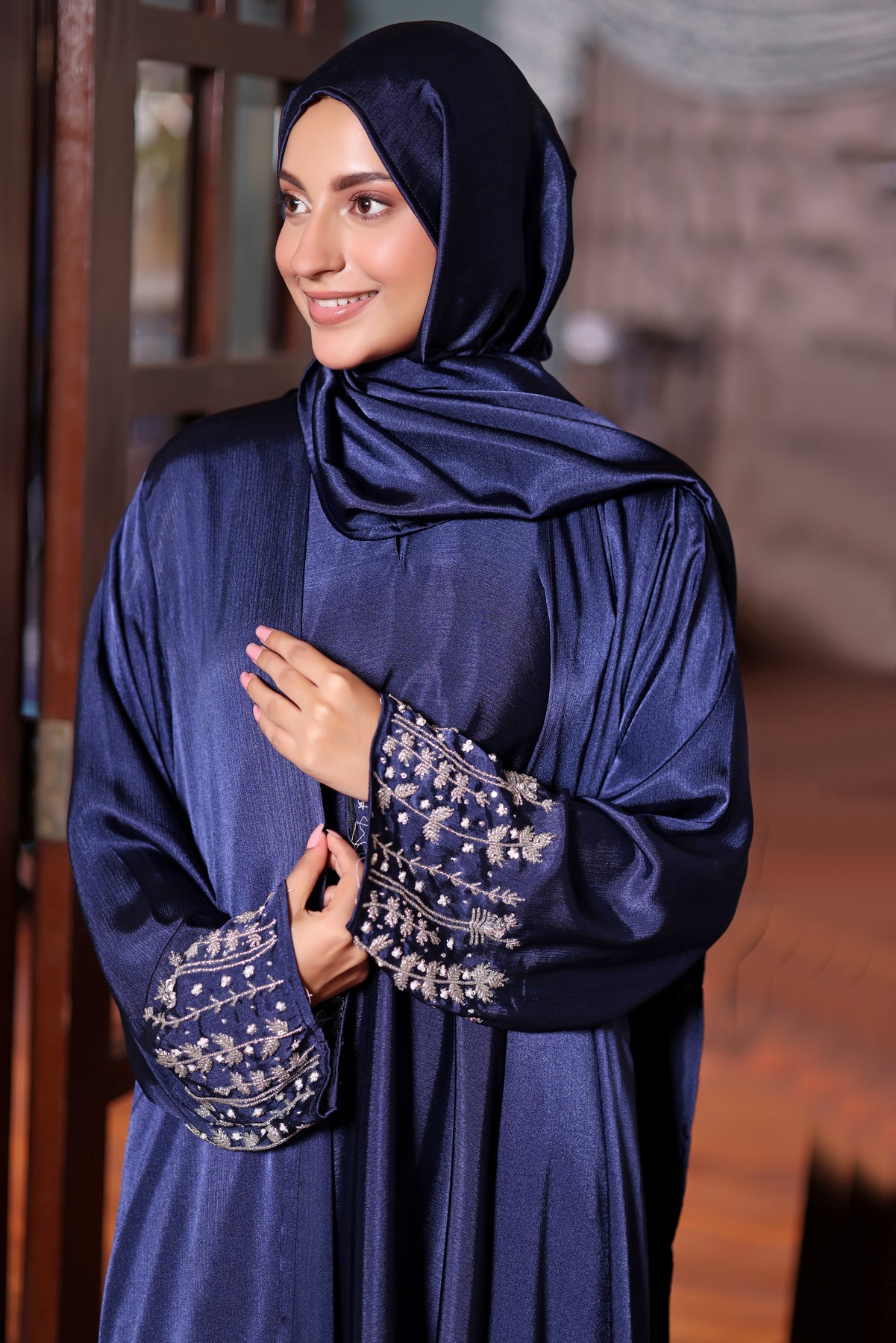 Classic elegance meets refined detailing in  this Abaya. Designed with a graceful flowing silhouette, this abaya exudes timeless sophistication with a modern touch. The rich midnight blue tone, enhanced by a soft satin-like sheen, creates a luxurious yet understated look.