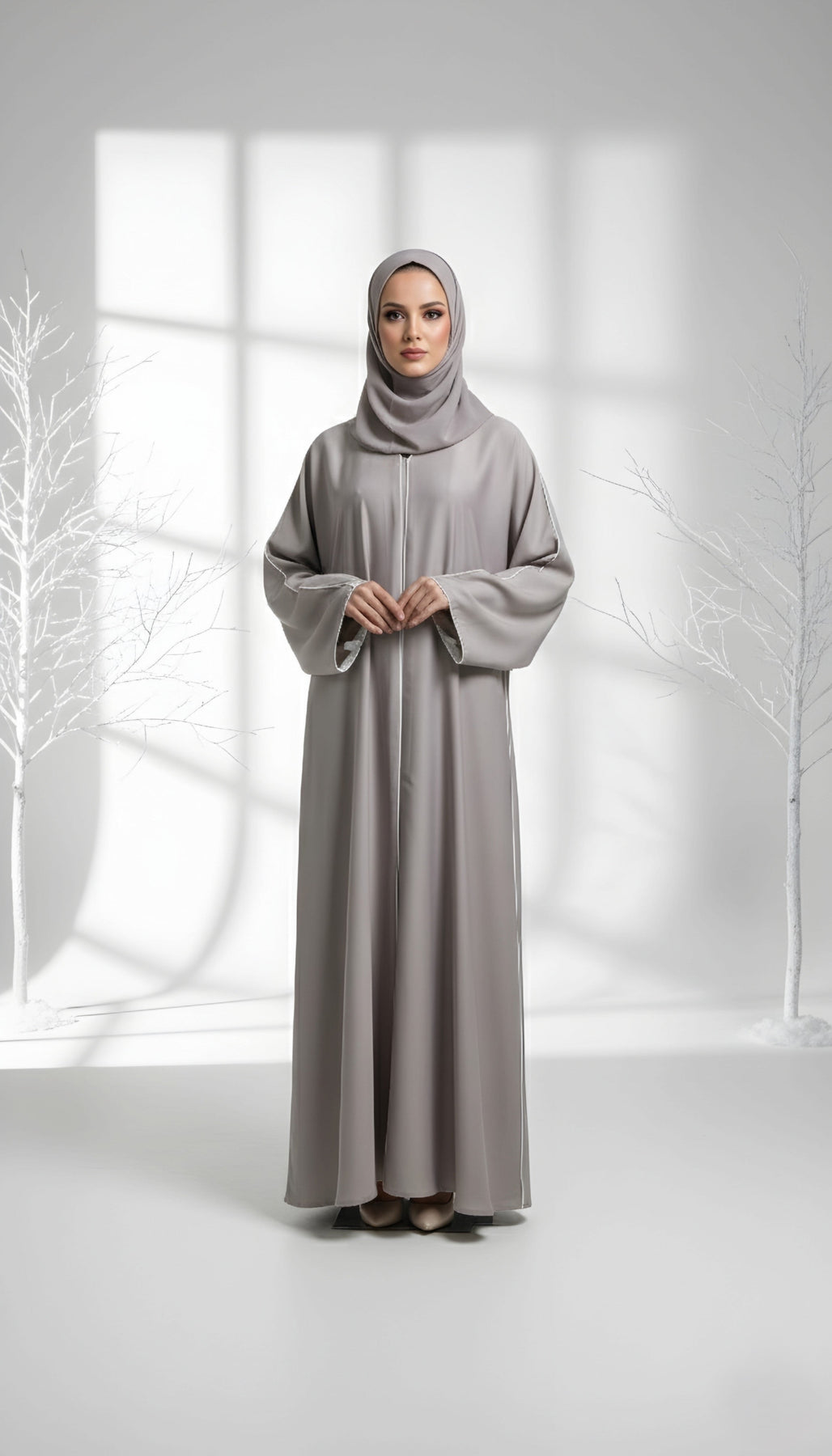 Understated elegance with a modern touch — the Sand Dust Abaya features sleek contrast piping on luxurious Nidha fabric, creating a graceful and timeless silhouette perfect for any occasion.
