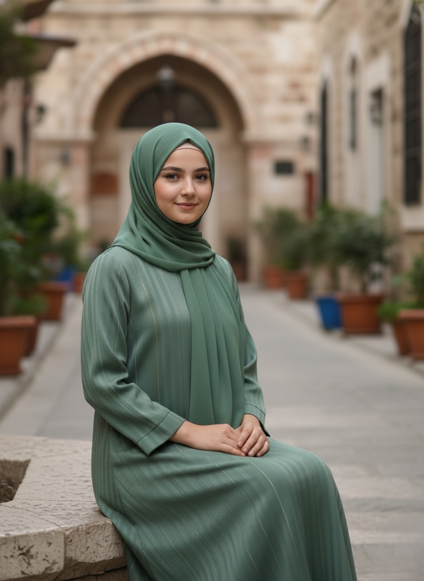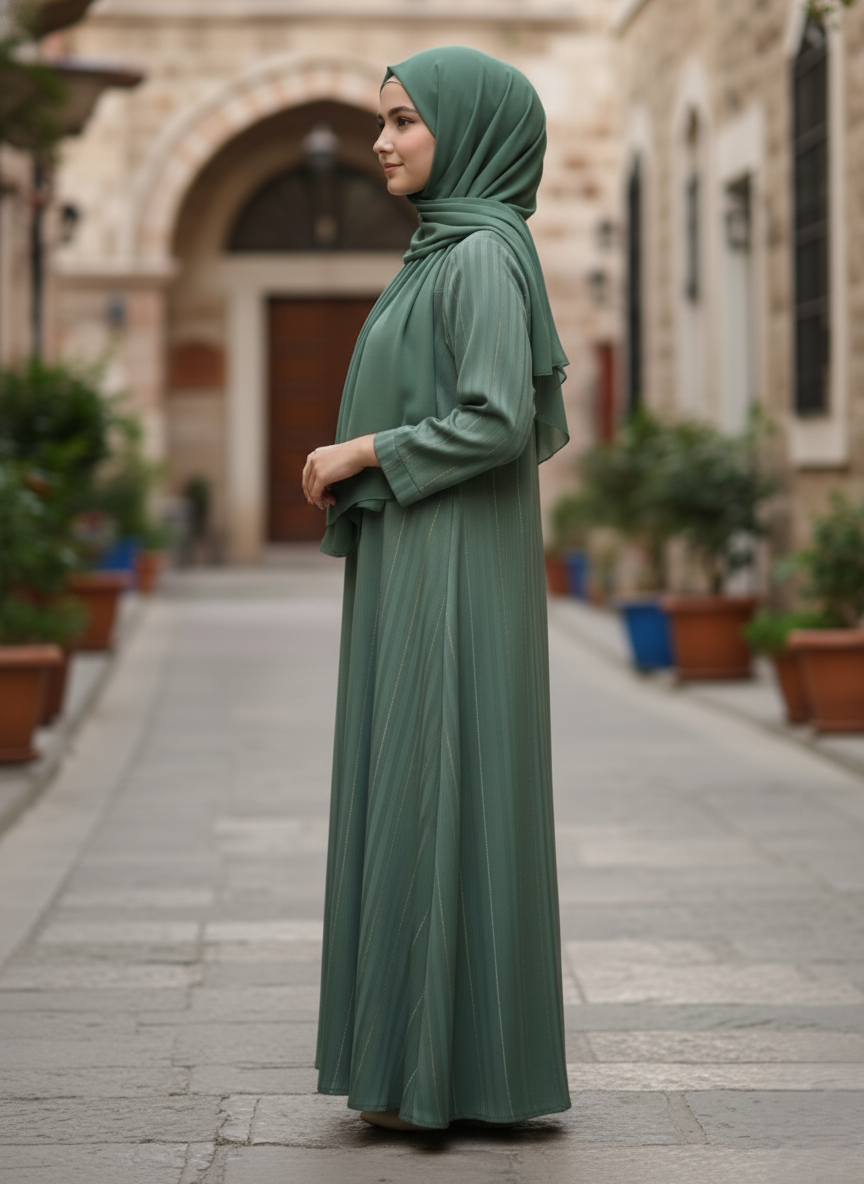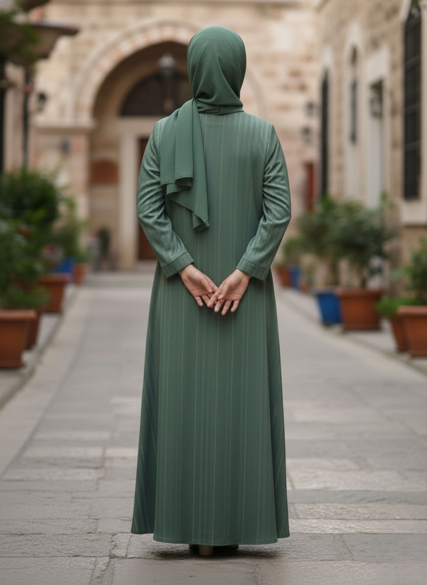 Refined, radiant, and effortlessly elegant — this Turquoise Zari-Line Abaya is a wardrobe essential for the modern modest woman.