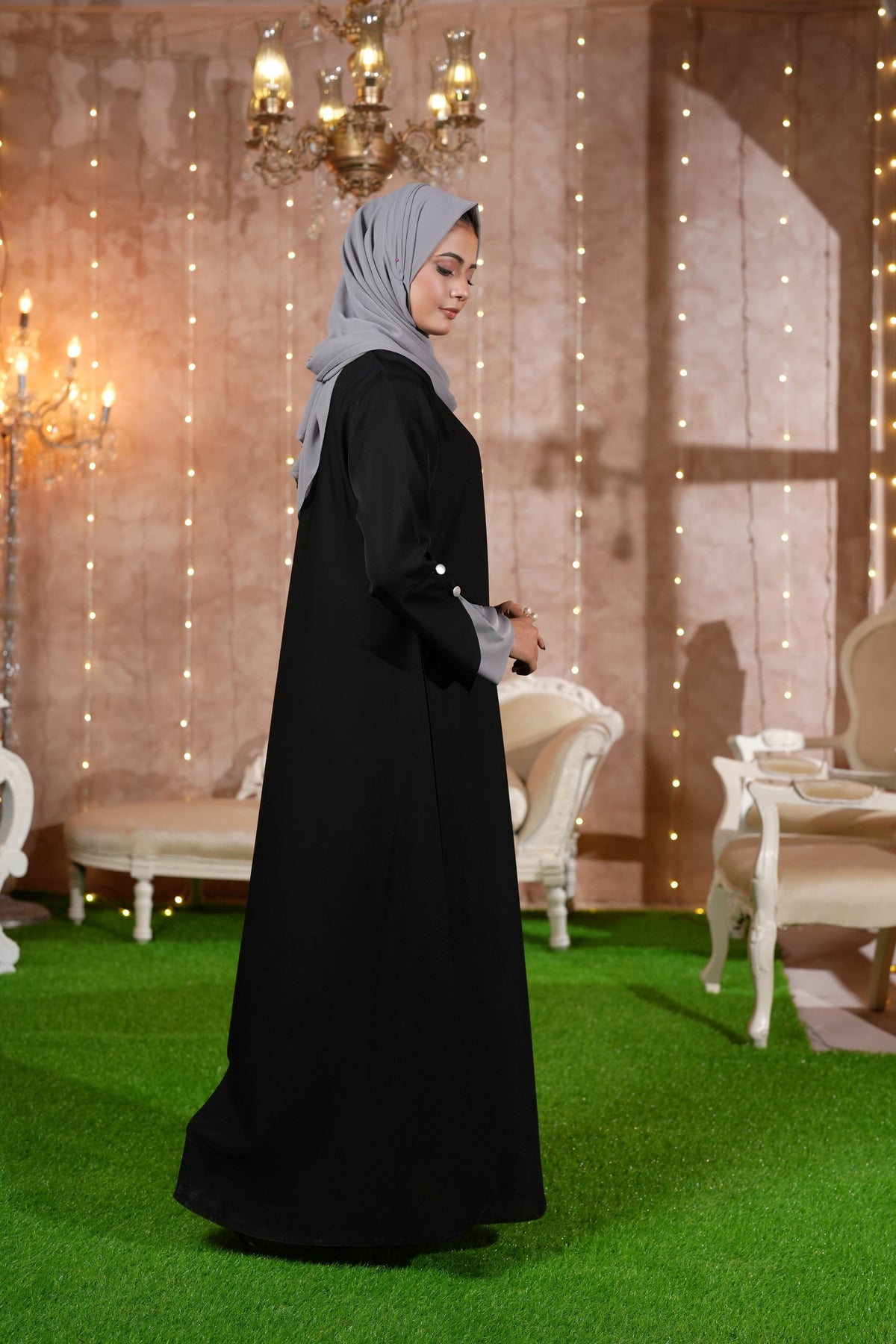 Gracefully minimal with a modern twist — this elegant black maxi abaya is crafted in premium Nidha fabric and elevated with statement bell sleeves in a soft contrasting grey. Accented with classic pearl button detailing, this piece blends sophistication and subtle flair, making it ideal for both casual chic and evening wear.