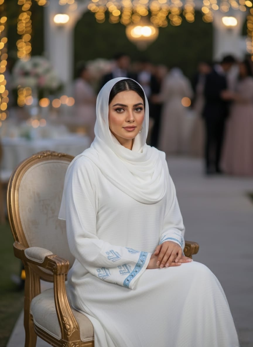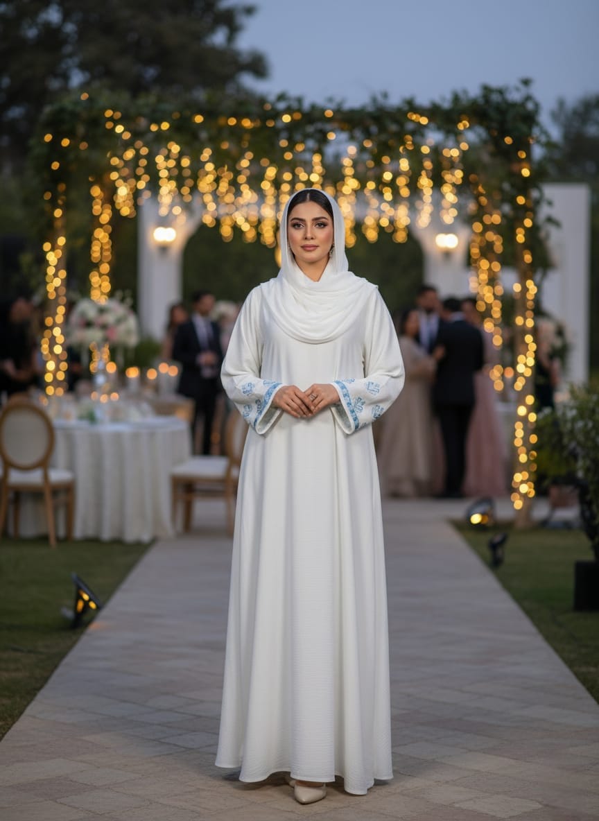 Radiant and refined — this White Embroidered Abaya is your go-to choice for timeless modest elegance.