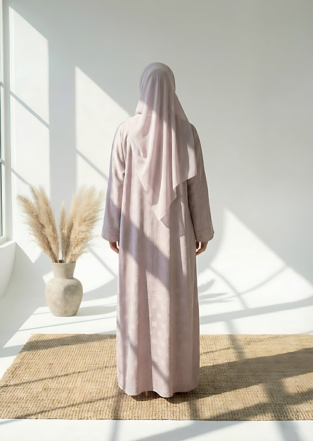 Refined, graceful, and endlessly versatile — this Grey Zari-Line Front-Open Abaya is the perfect balance of simplicity and sophistication.