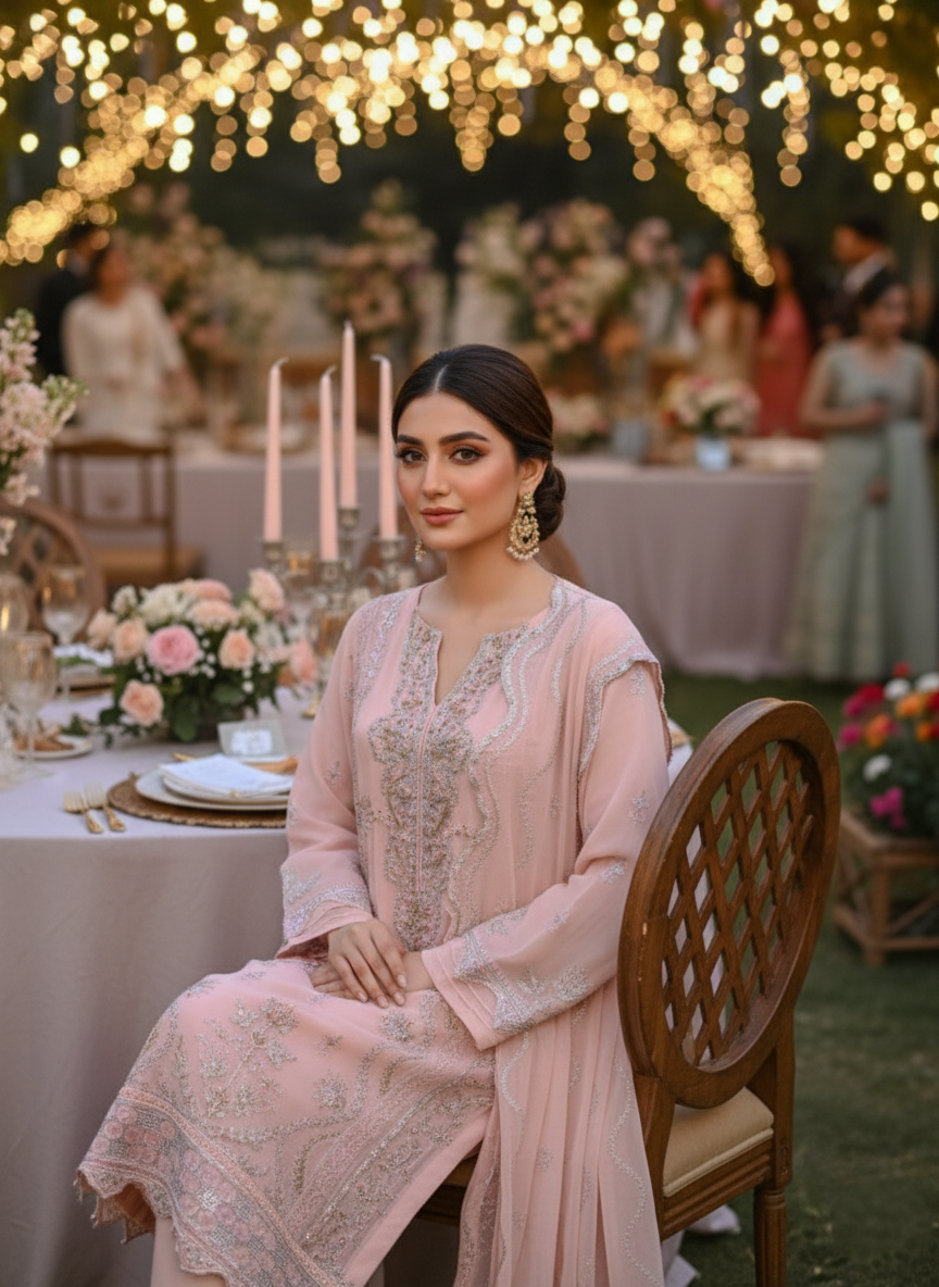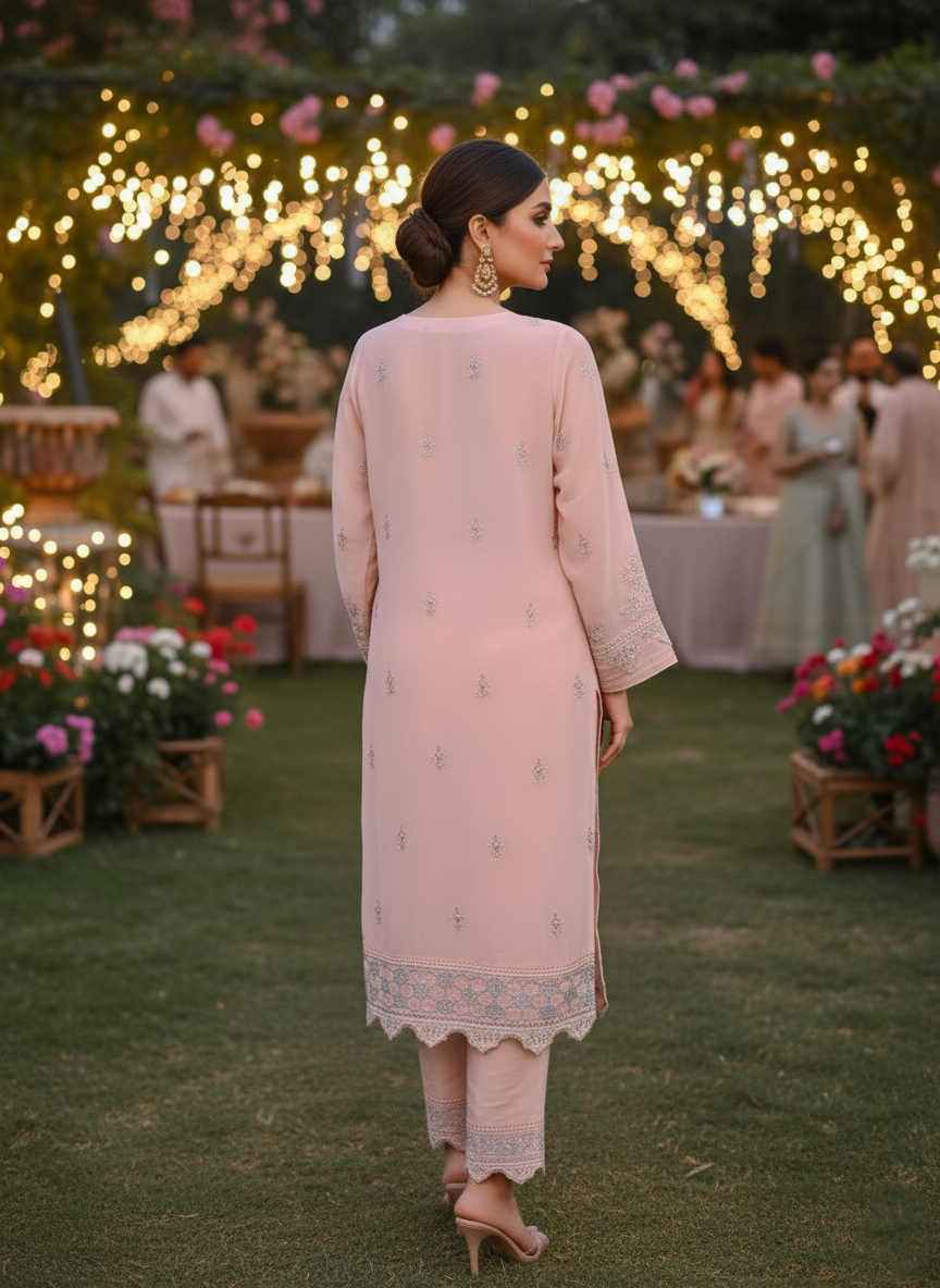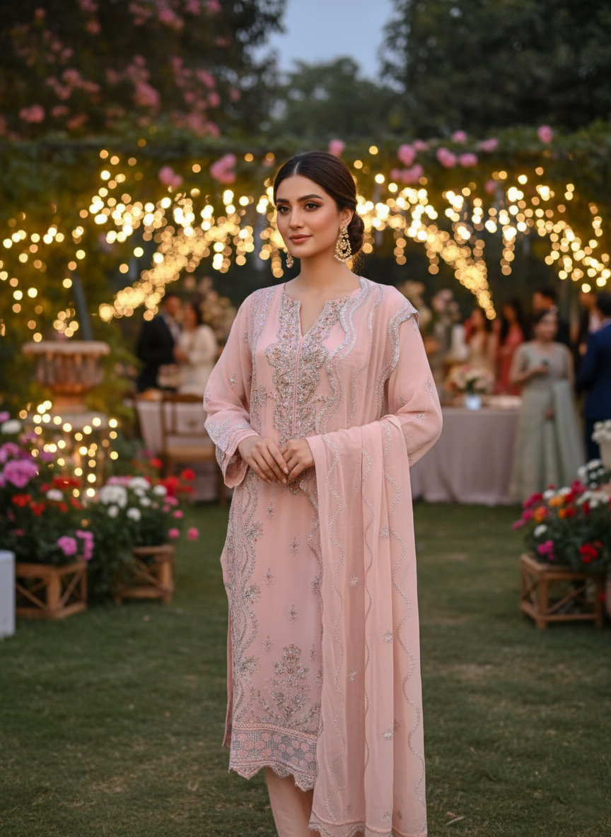 It's time to take your fashion game farthest with a 3-piece chiffon ensemble. The gilded embroidery elaborates the artistic detailing over the shirt. The striking touch of golden intimately complements the outfit's colour. The dupatta accentuates proficiently crafted embroidery. It comes with the silk dyed trouser, draped in elegance.