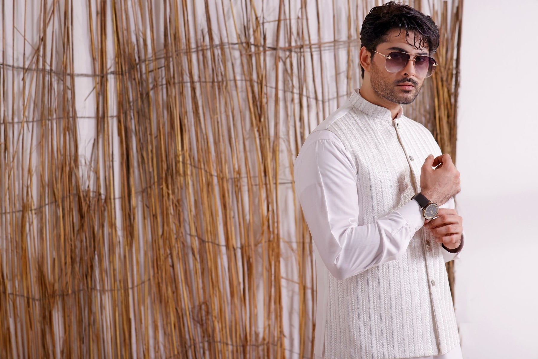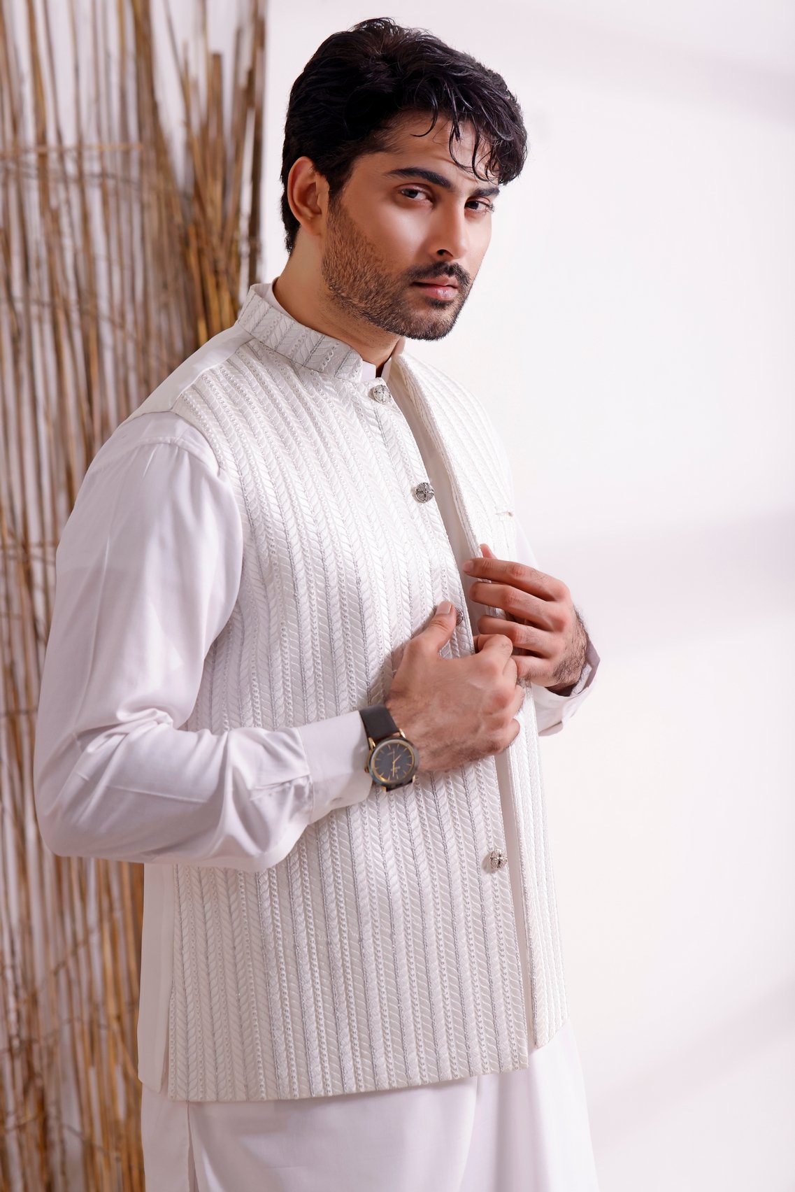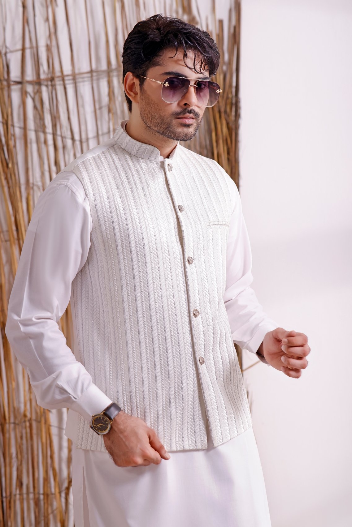 Men's Formal Waistcoat with Suit on White Rib with Sequence Embroidery.