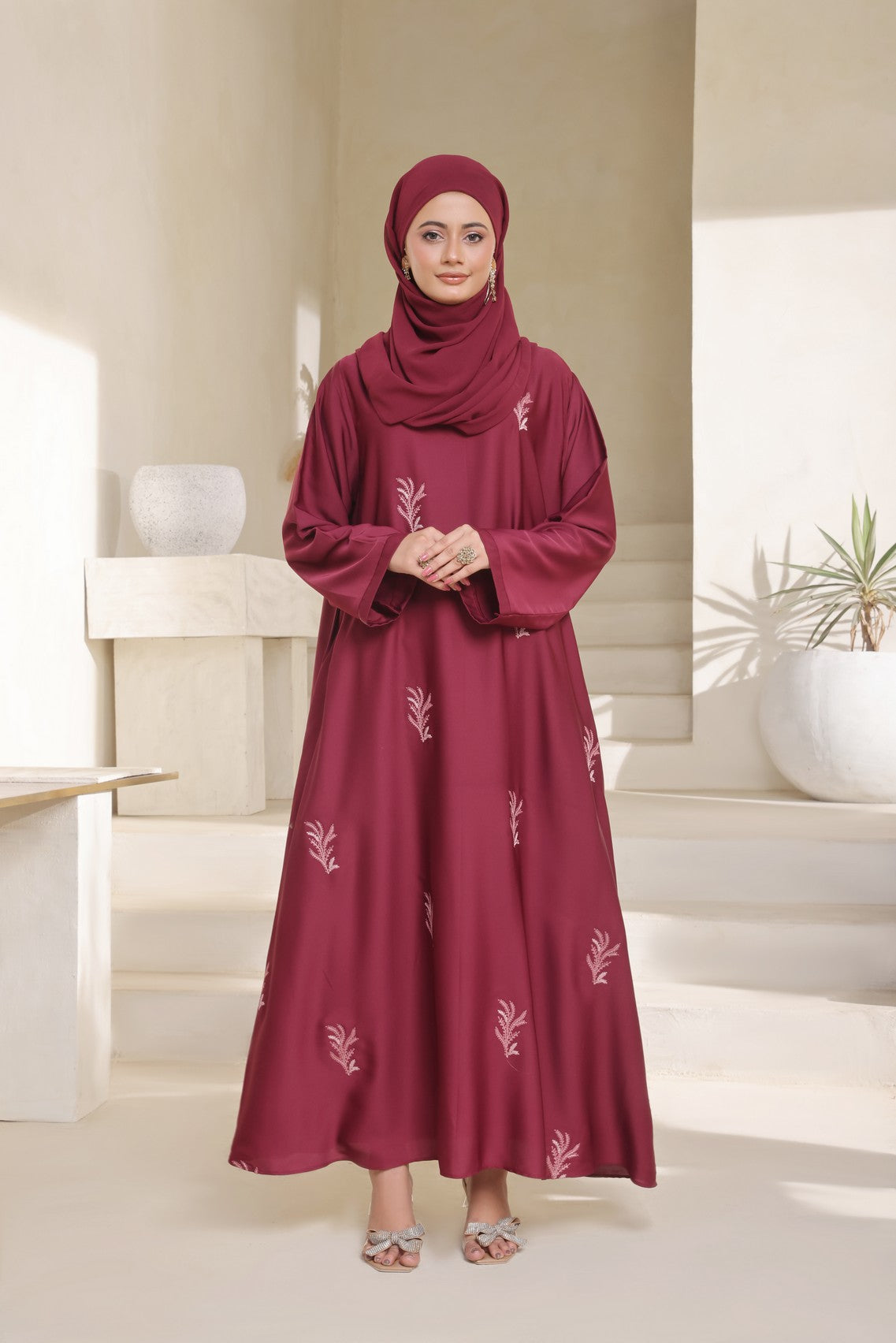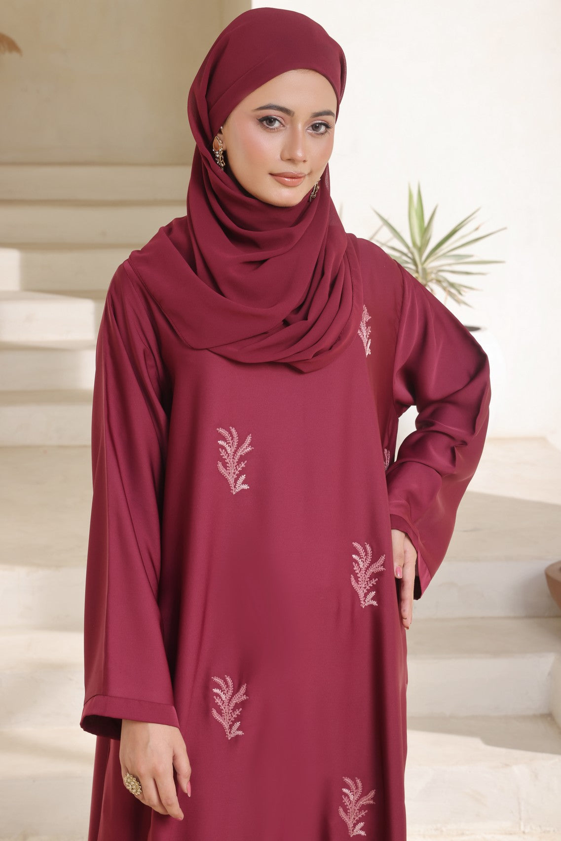 Turn heads with effortless elegance in our luxurious maroon embroidered abaya. Designed for the modern woman who values both style and modesty, this abaya combines sophistication with comfort.