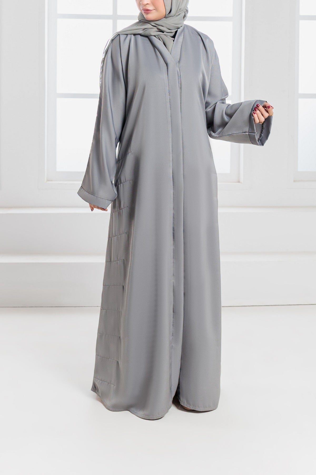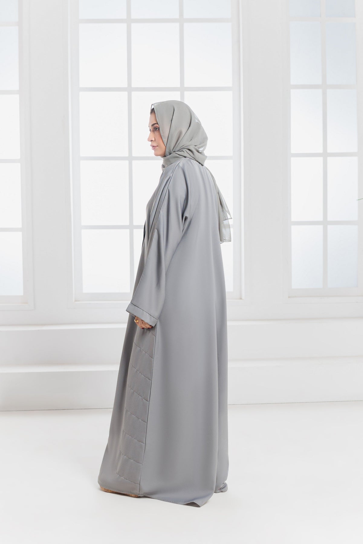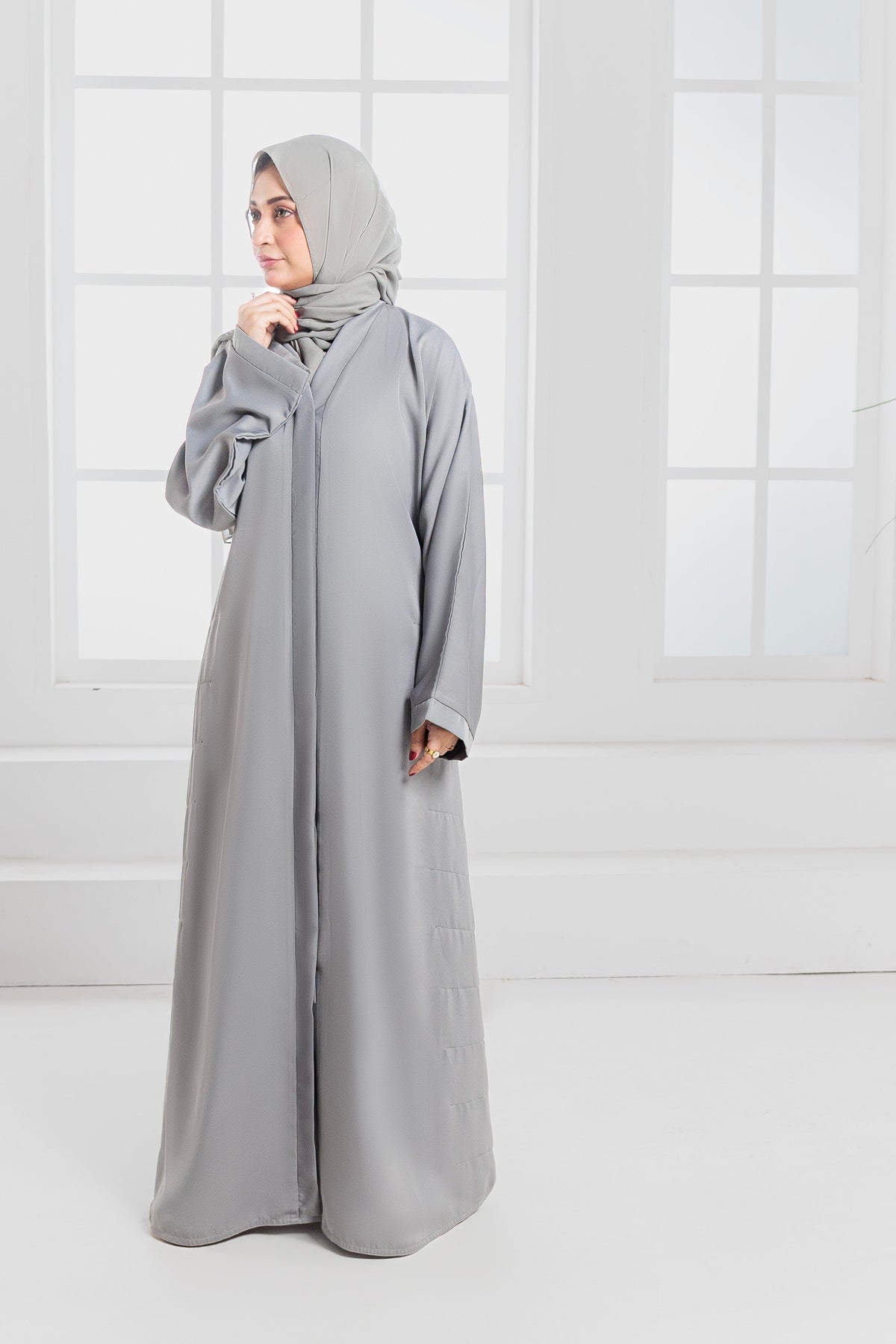 Subtle, elegant, and effortlessly chic is your go-to for graceful everyday wear. Made from Imported Luxe Nidha fabric in a cool grey hue, this front-open design features soft, loose sleeves and detailed stitching along the side panels for a refined finish. Paired with a pure Korean chiffon Sheila, this abaya brings timeless charm in every detail.