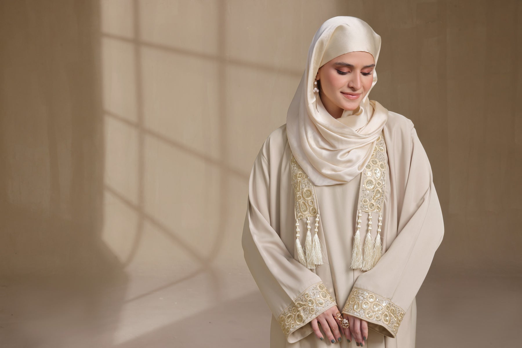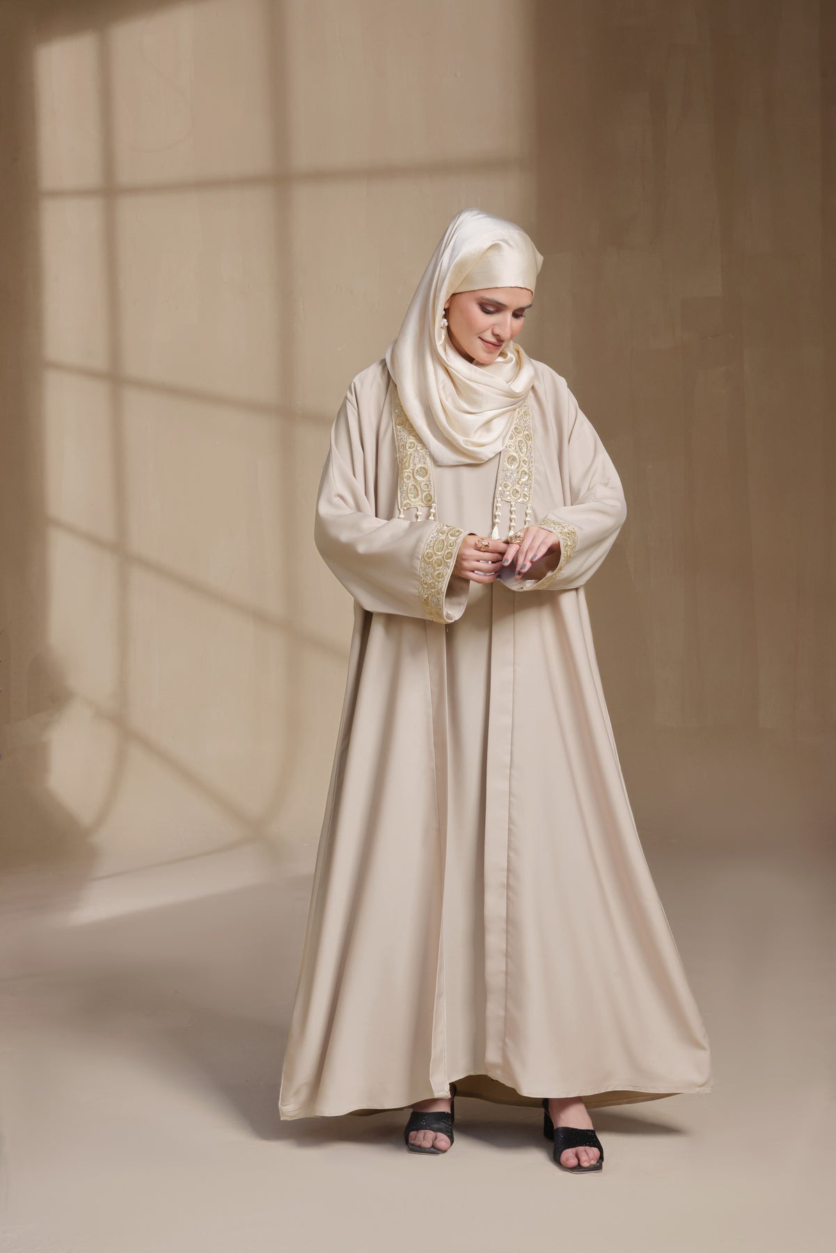 Step into understated luxury with this Cream Embroidered Abaya — where classic modest fashion meets modern elegance.