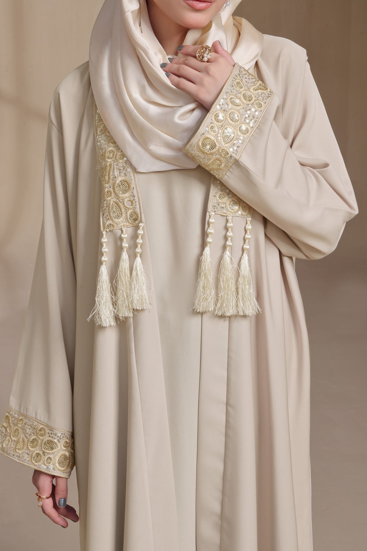Exude grace and sophistication with this front-open abaya in a soft cream hue, beautifully accented with intricate embroidery along the front panels and cuffs. Paired with a matching satin-finish hijab, this design is the perfect blend of modesty and timeless elegance.