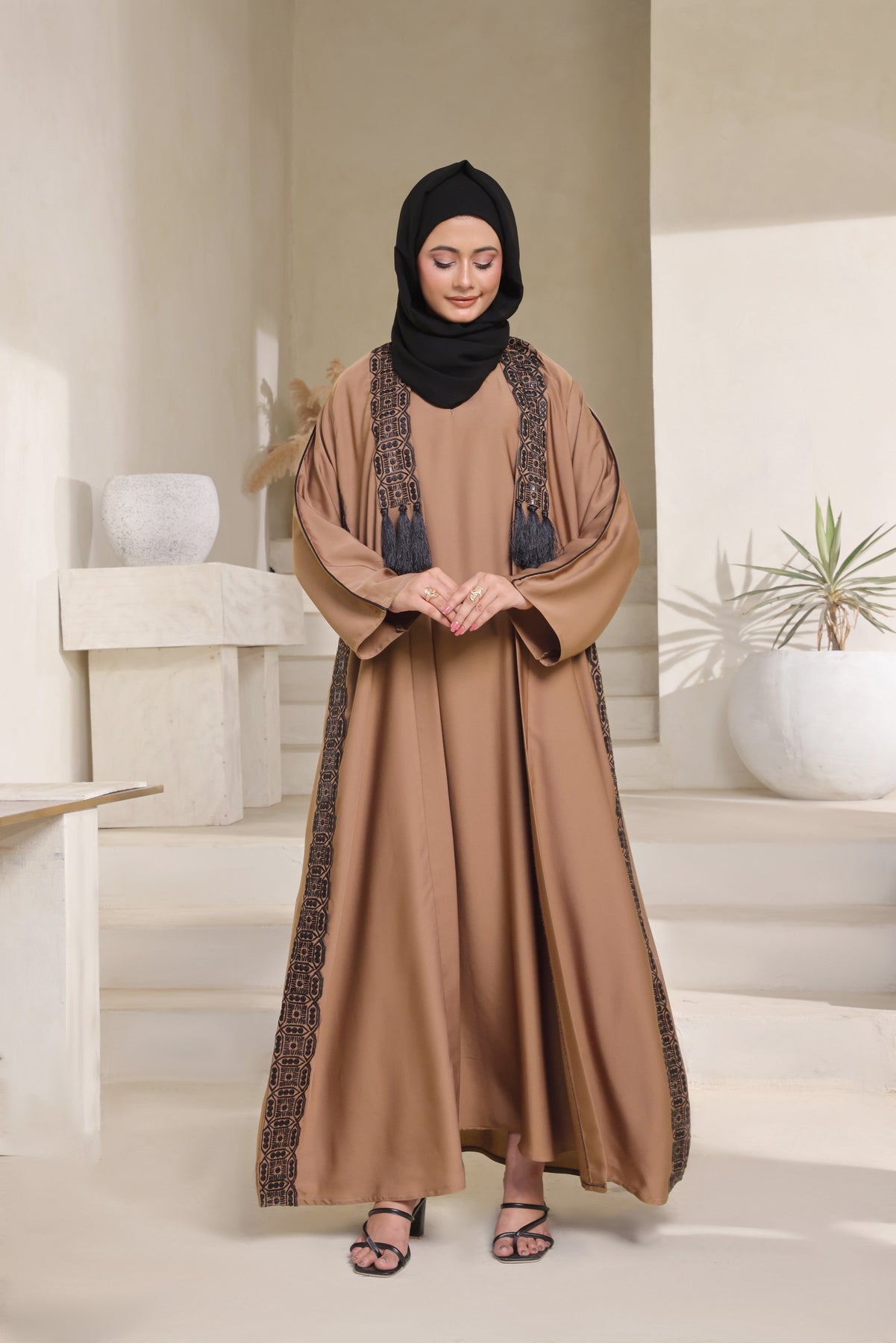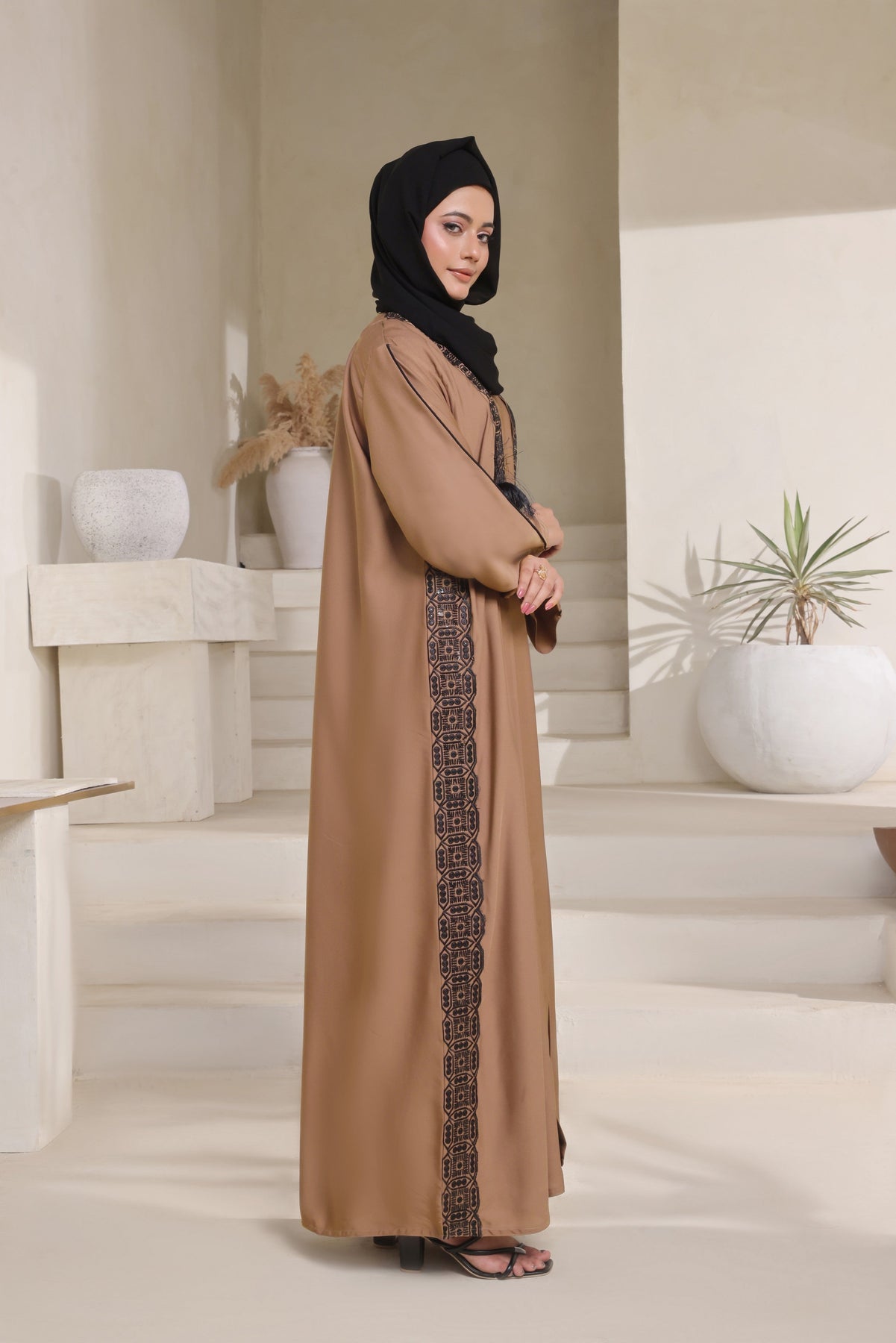Step into a world of earthy elegance with the Desert Dusk Abaya – your go-to for refined yet expressive modest fashion.