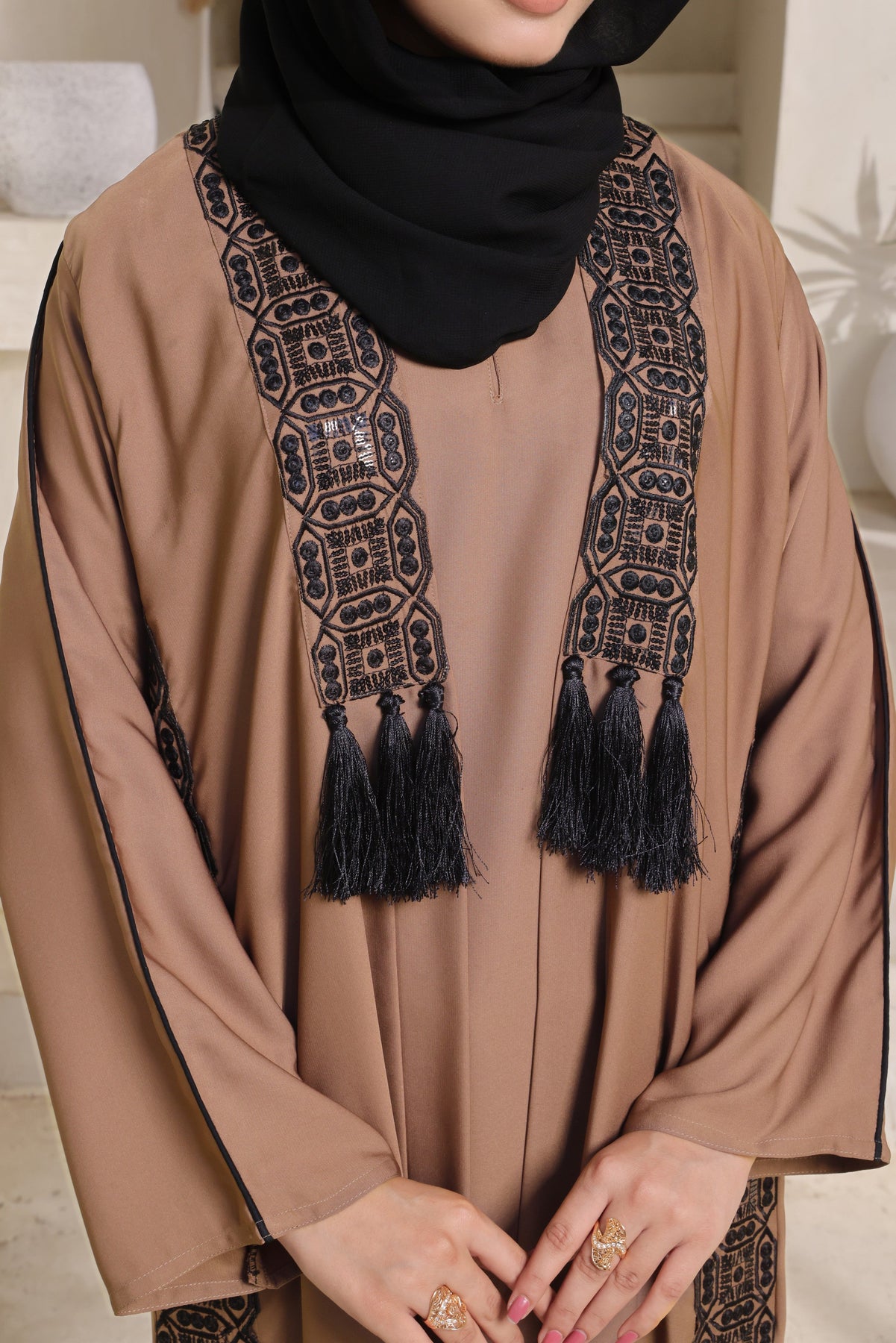 A statement of heritage and grace, our Desert Dusk Abaya blends classic charm with contemporary elegance. Crafted from soft Korean Nidha fabric in a warm camel-brown tone, this piece is elevated with rich embroidered panels and tassel accents for a timelessly sophisticated look.