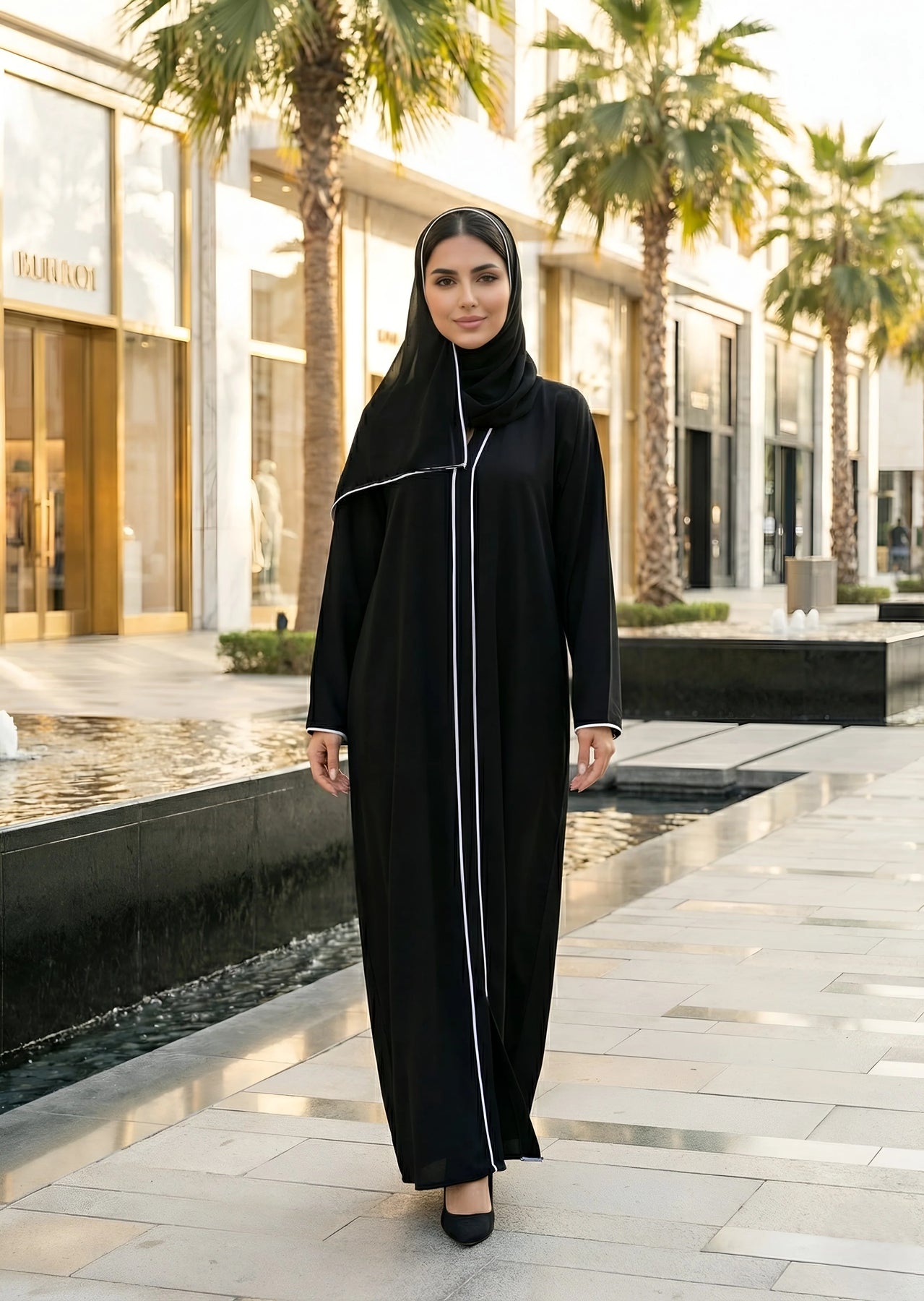 Elegant, bold, and effortlessly sophisticated — this black front open abaya is a striking expression of modern modest elegance. Designed in a deep jet-black tone and elevated with clean contrast piping, it offers a powerful yet graceful silhouette. The minimal detailing and fluid fall make it a timeless statement for women who value refined simplicity.