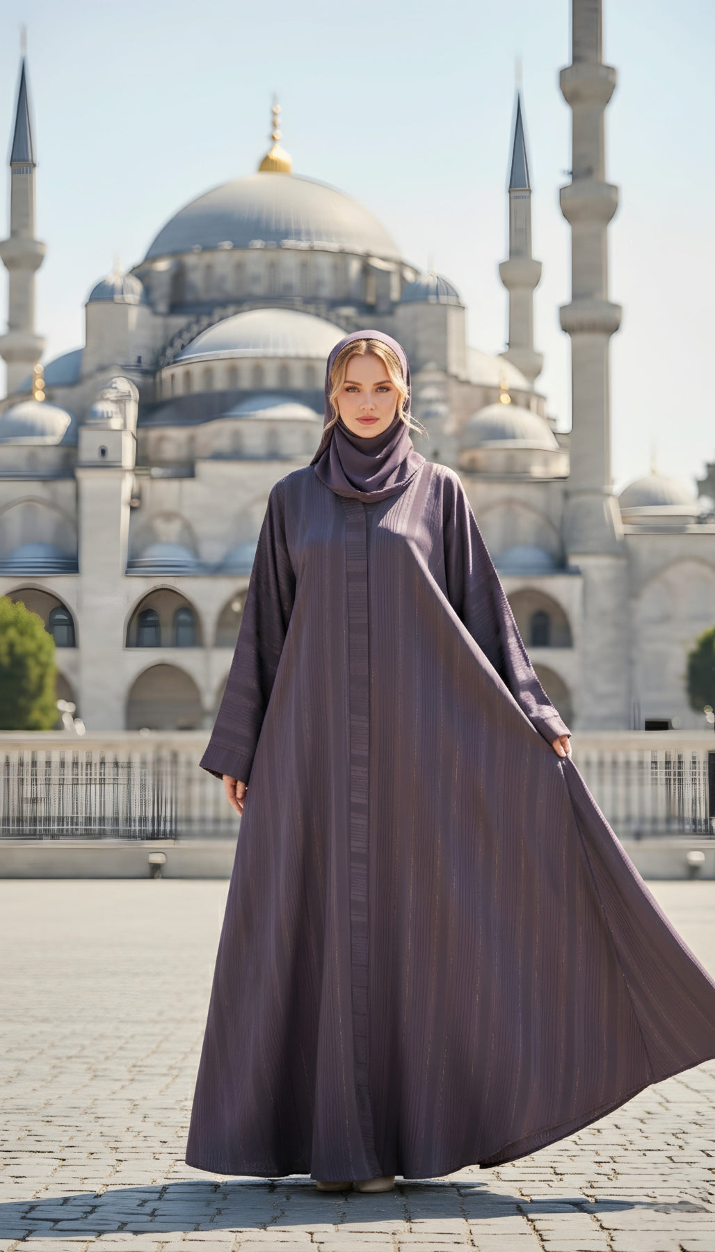 Refined, graceful, and effortlessly chic — this Plum Zari-Line Front-Open Abaya is a must-have for the modern modest wardrobe.