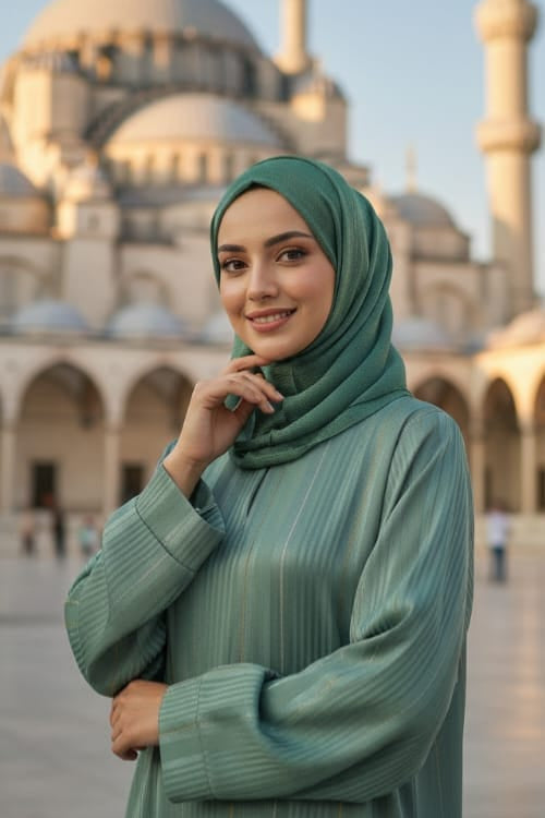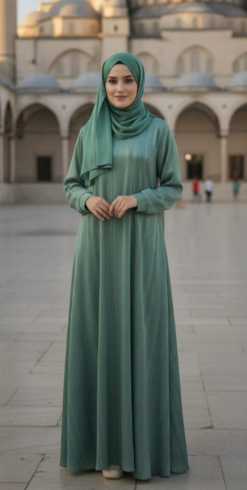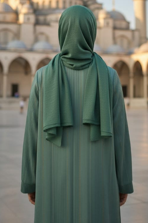Refined, radiant, and effortlessly elegant — this Turquoise Zari-Line Abaya is a wardrobe essential for the modern modest woman.