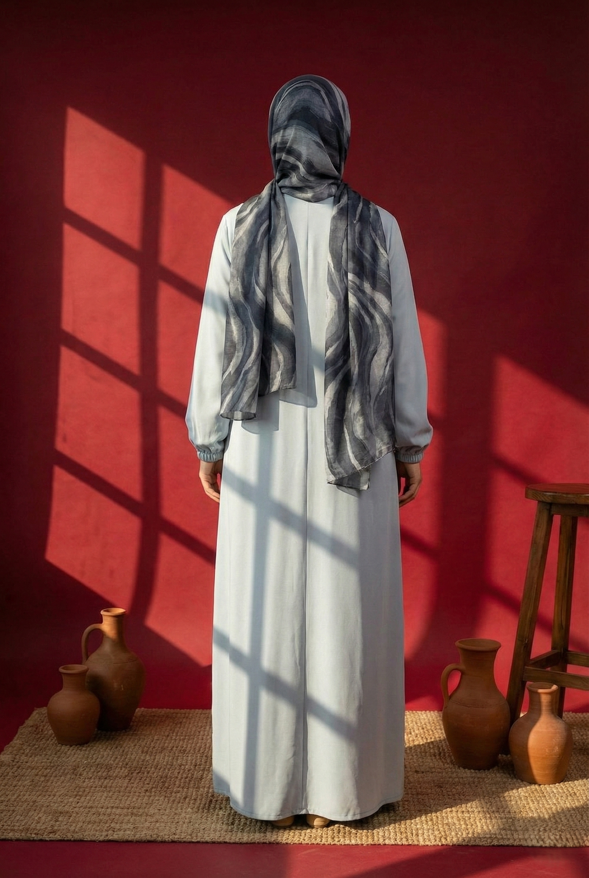 💠 Coordinated Printed Hijab: Comes paired with a stylish abstract-pattern hijab that adds depth and visual interest to the minimal base.