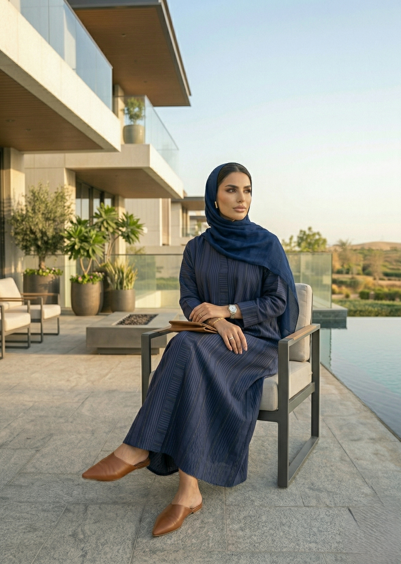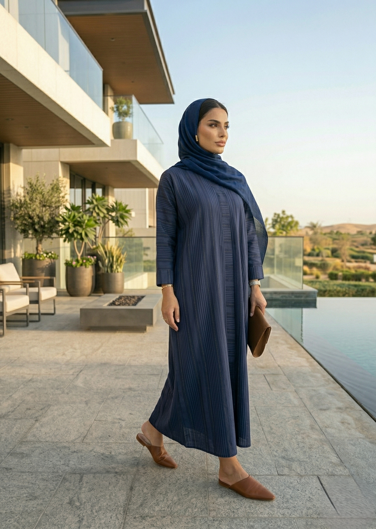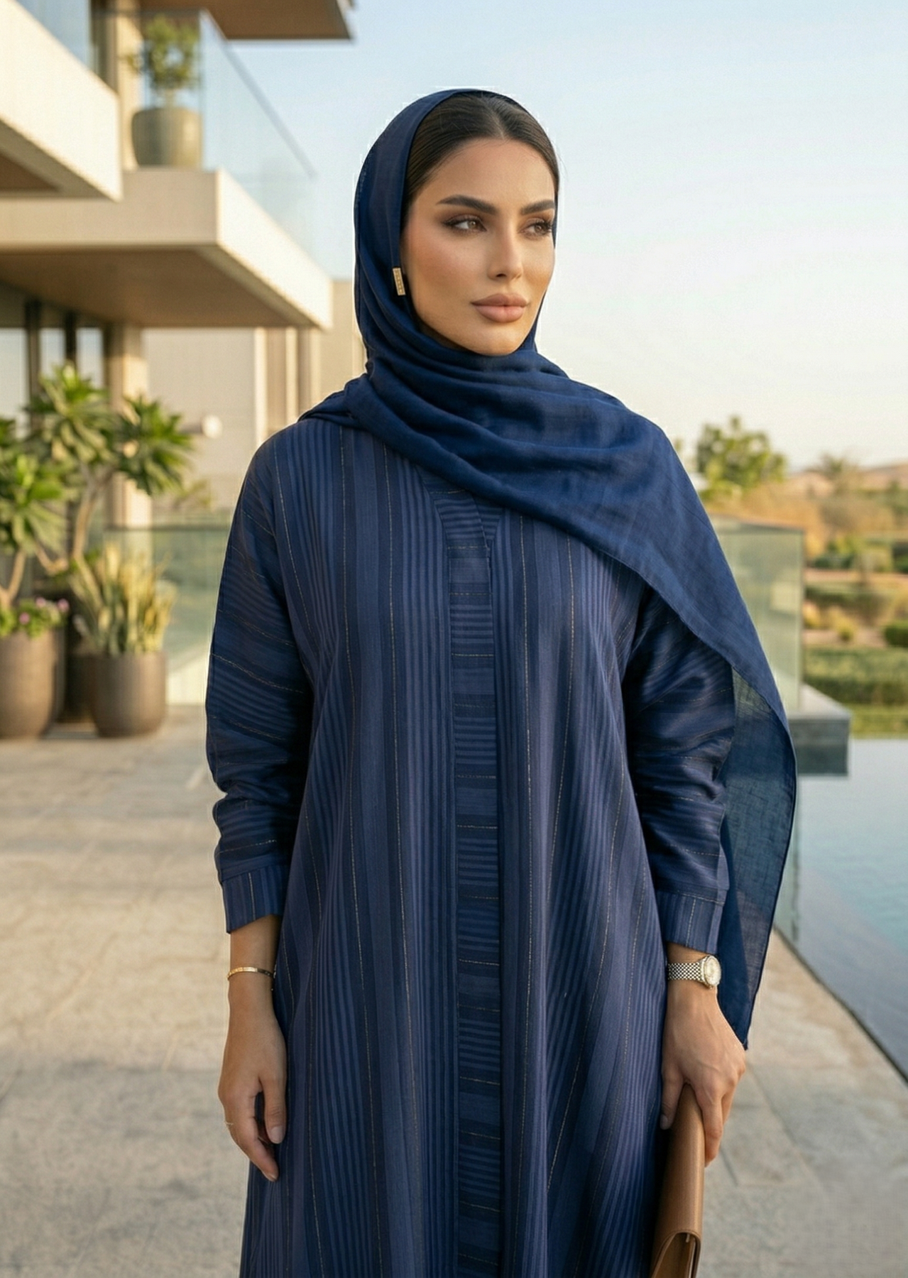 Grace meets sophistication in this serene blue abaya, crafted from premium textured Zoom Nidha adorned with delicate zari lines. The fabric’s graceful fall and subtle sheen create a refined silhouette, while the soothing blue hue captures timeless charm and effortless elegance. Designed with a versatile front-open cut, this abaya is the perfect blend of simplicity and luxury.
