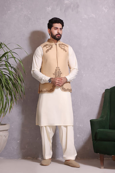 Men's Formal Jamawar Waistcoat with Handwork of Antique and Gold.